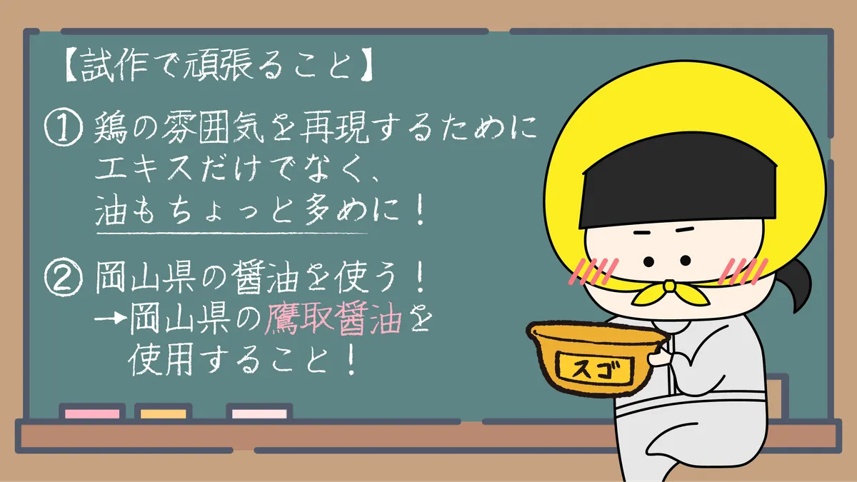 ➡この味に最適な岡山県の醤油を検討!そして岡山県の鷹取醤油を使用!