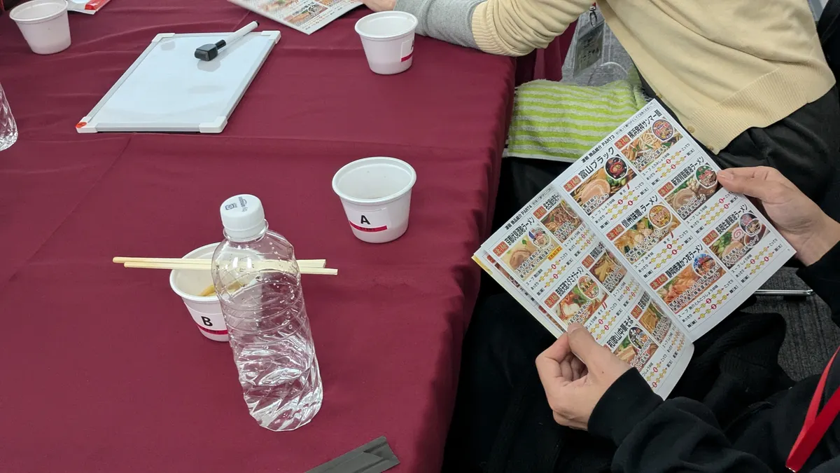 白いカップに入った一口サイズのラーメンを食べ、どの凄麺か当てるクイズです🍜