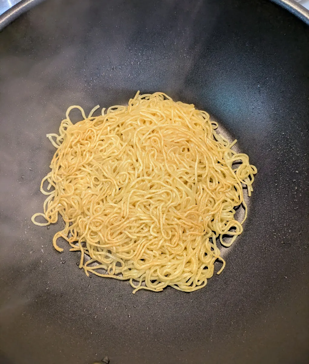 茹で上がった麺を湯切りし、ごま油で両面色づく程度に焼きます。