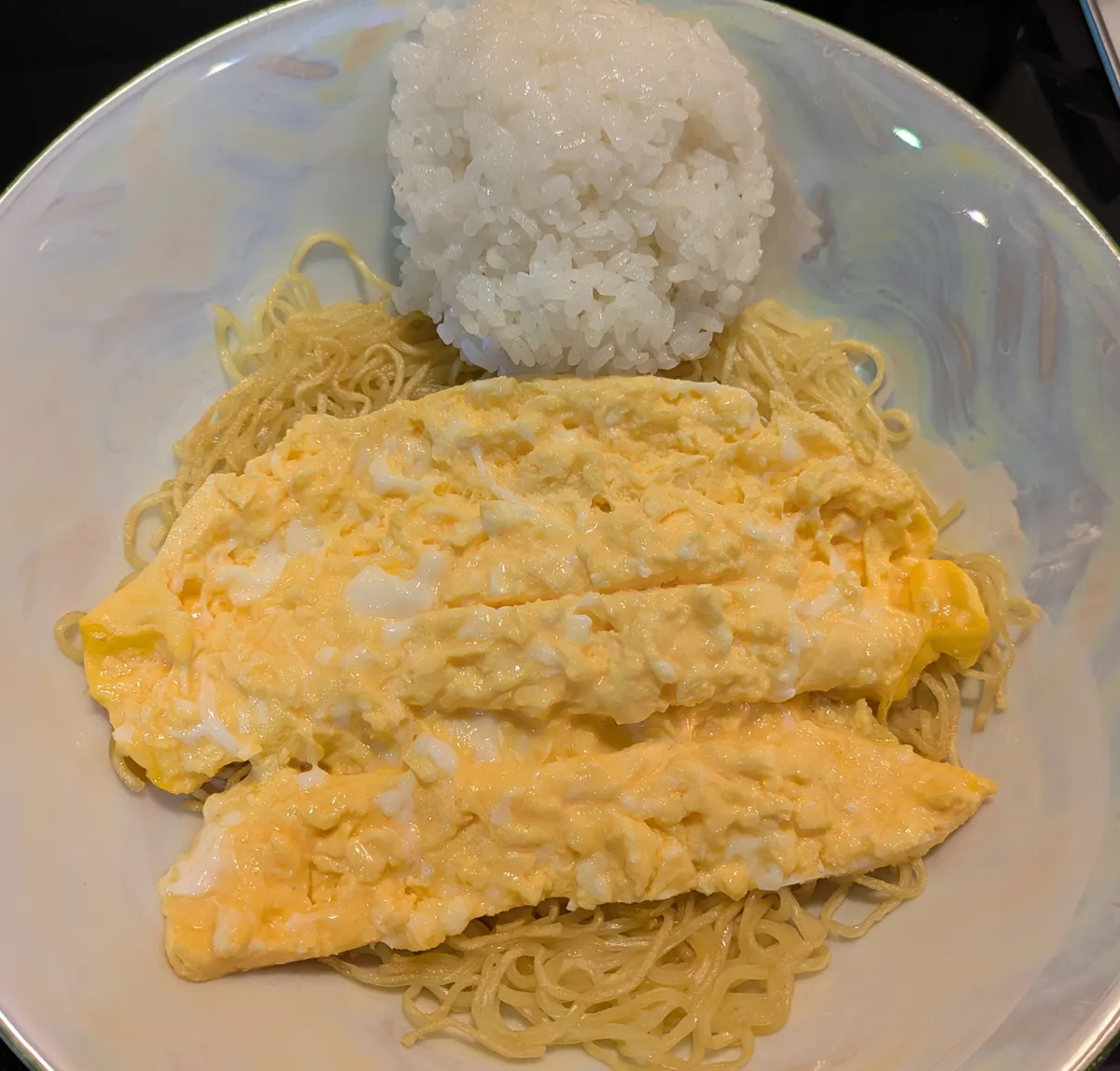 皿に麺、ご飯、プレーンオムレツを乗せ…