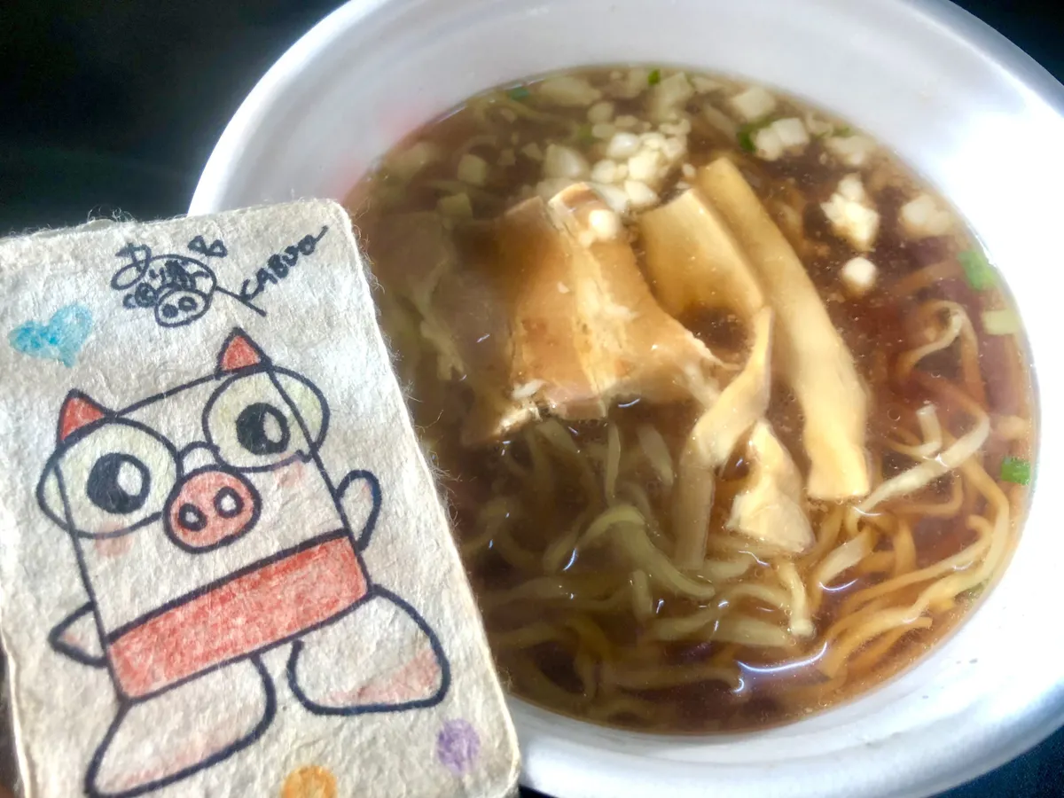 初めましての方も増えてきた?ので改めて。ちよちゃんです。「未来からやってきた、ありがとうが大好き!ありがとうの旅人のKABOO(かぶぅ)」というキャラクターを描いてます。KABOOも凄麺が好きで、スゴ活してると「僕も食べたい」と寄って来ます💕