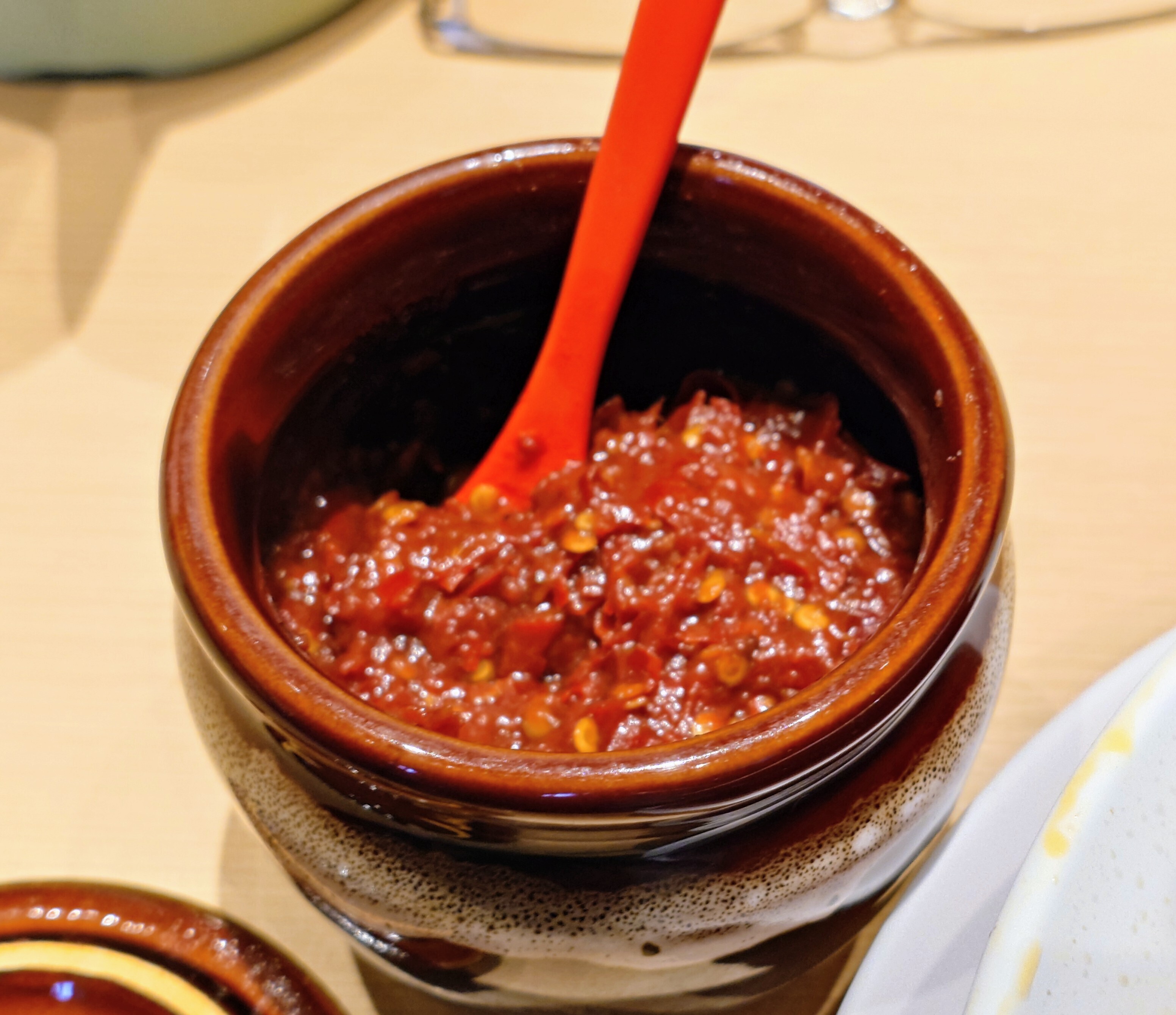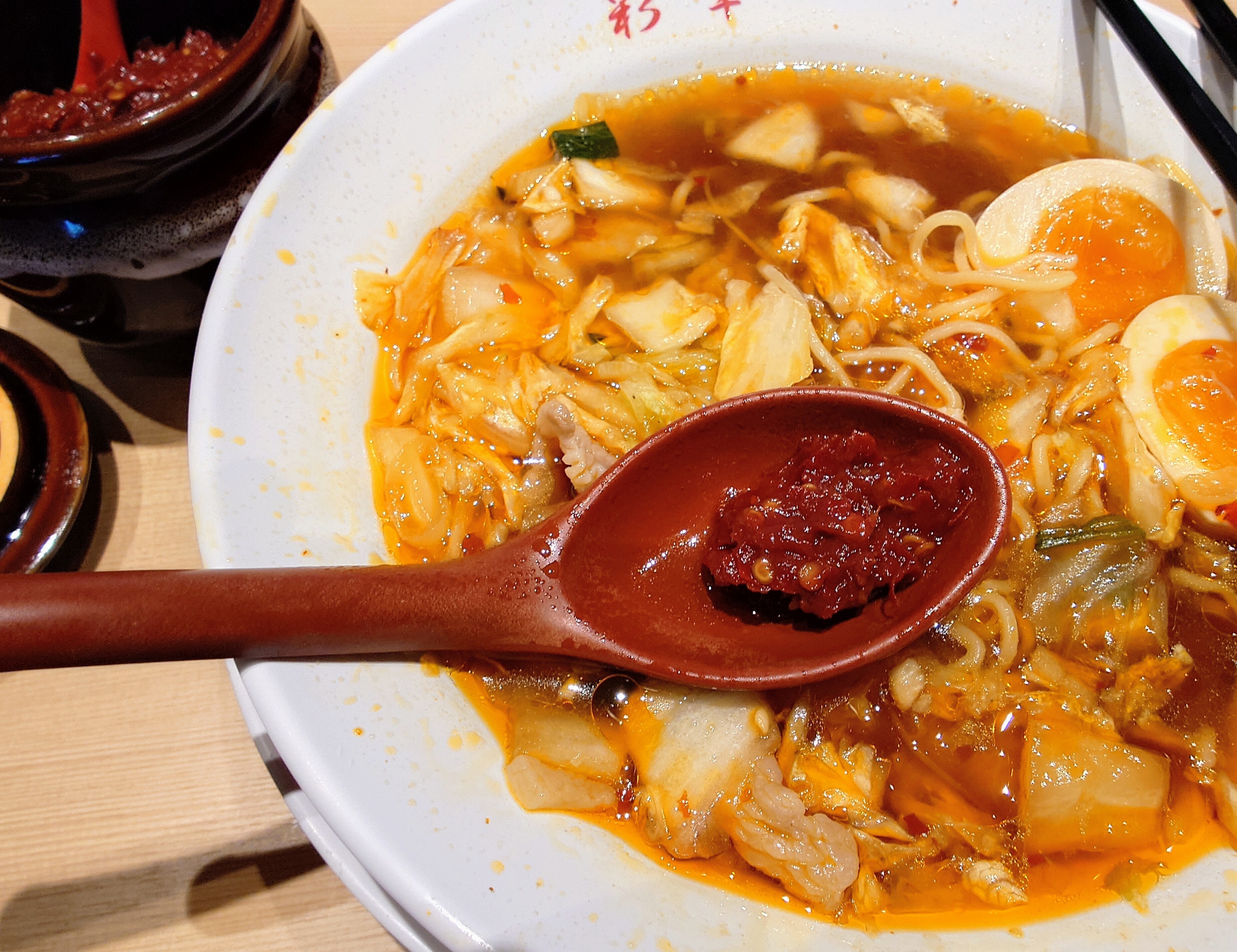 ラージャン(特製の豆板醤)を追加して辛さを増します。辛さと塩気を足して味変。