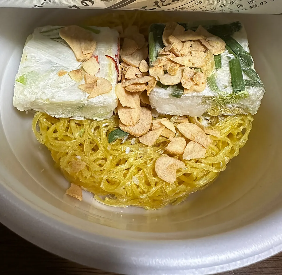 今日はこんな感じで入れていきます。緑は白菜ニラ?フライドガーリックもパラパラ