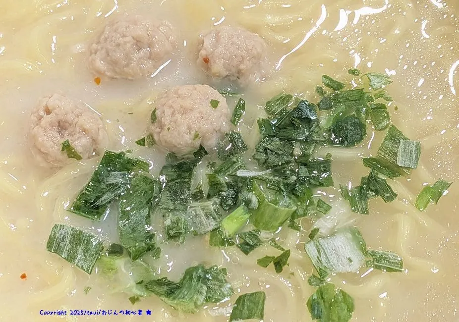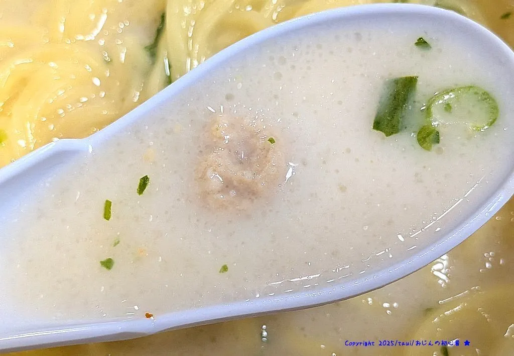 大きな鶏だんごは鶏白湯スープといいマッチングです、メンマは残してほしかったかな?