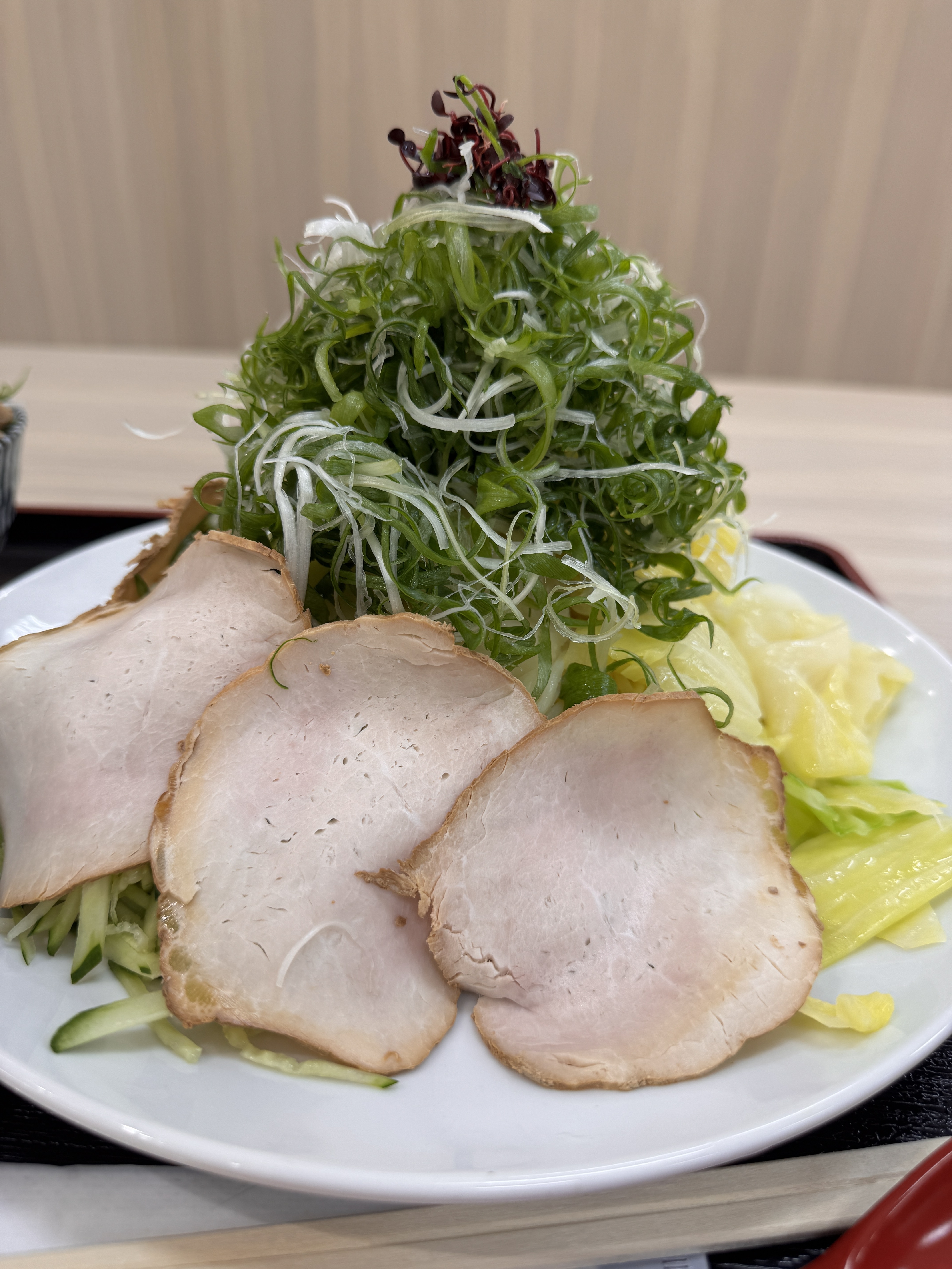 投稿を表示麺、野菜の上にネギタワー
