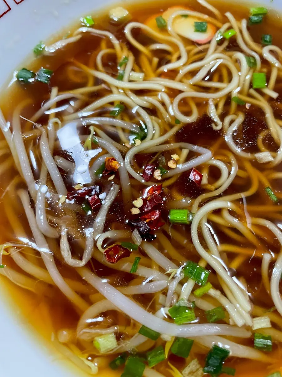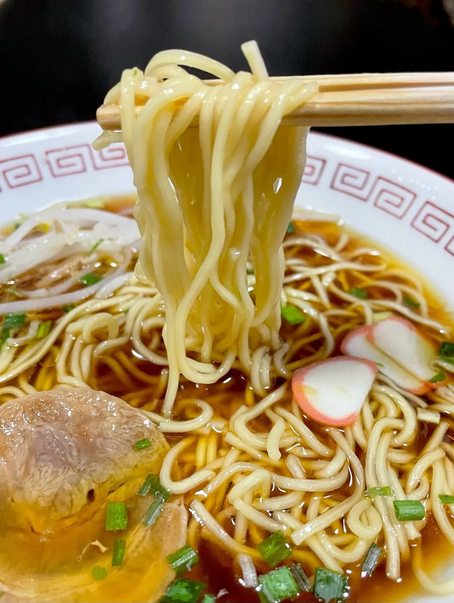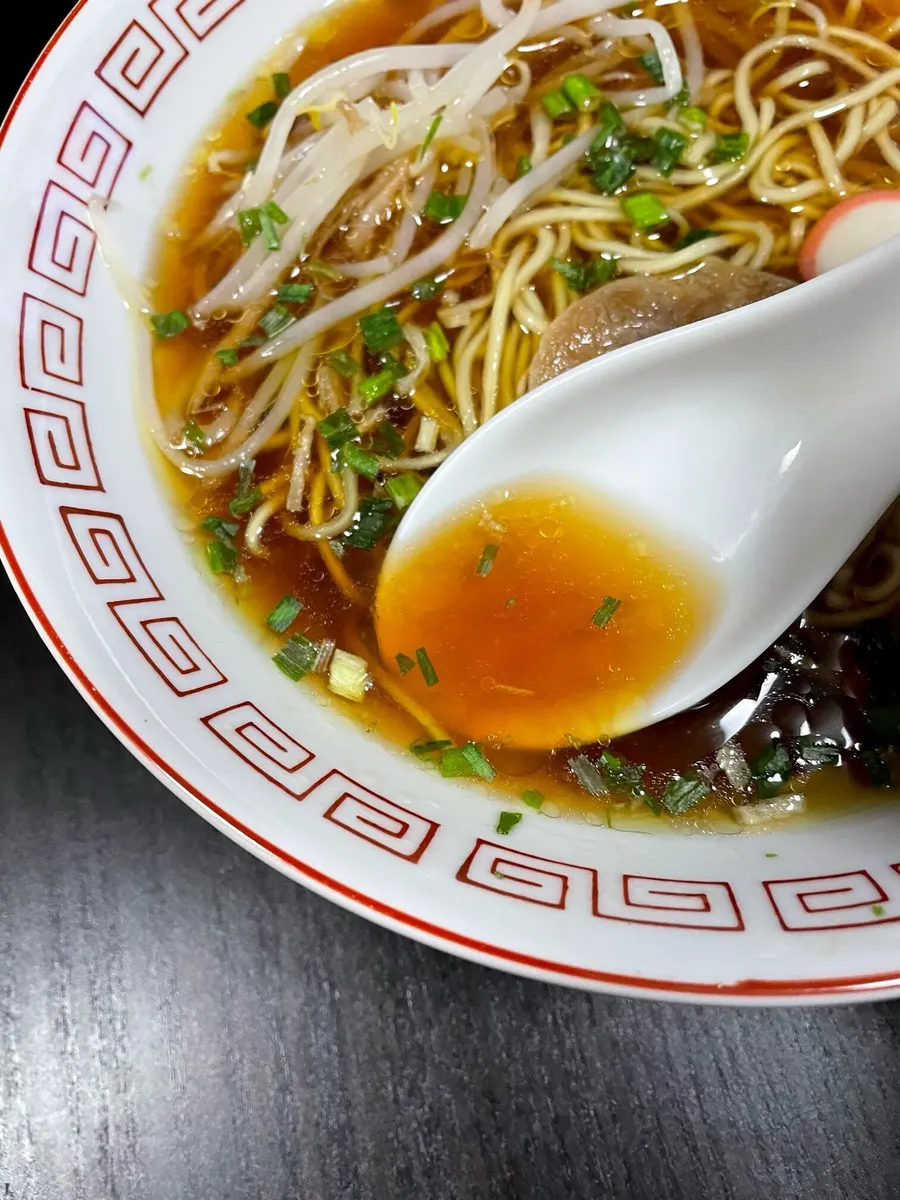 もやしを足しましたが出来上がりはこんな感じです。下の方の麺まで見えるスープの透明感!