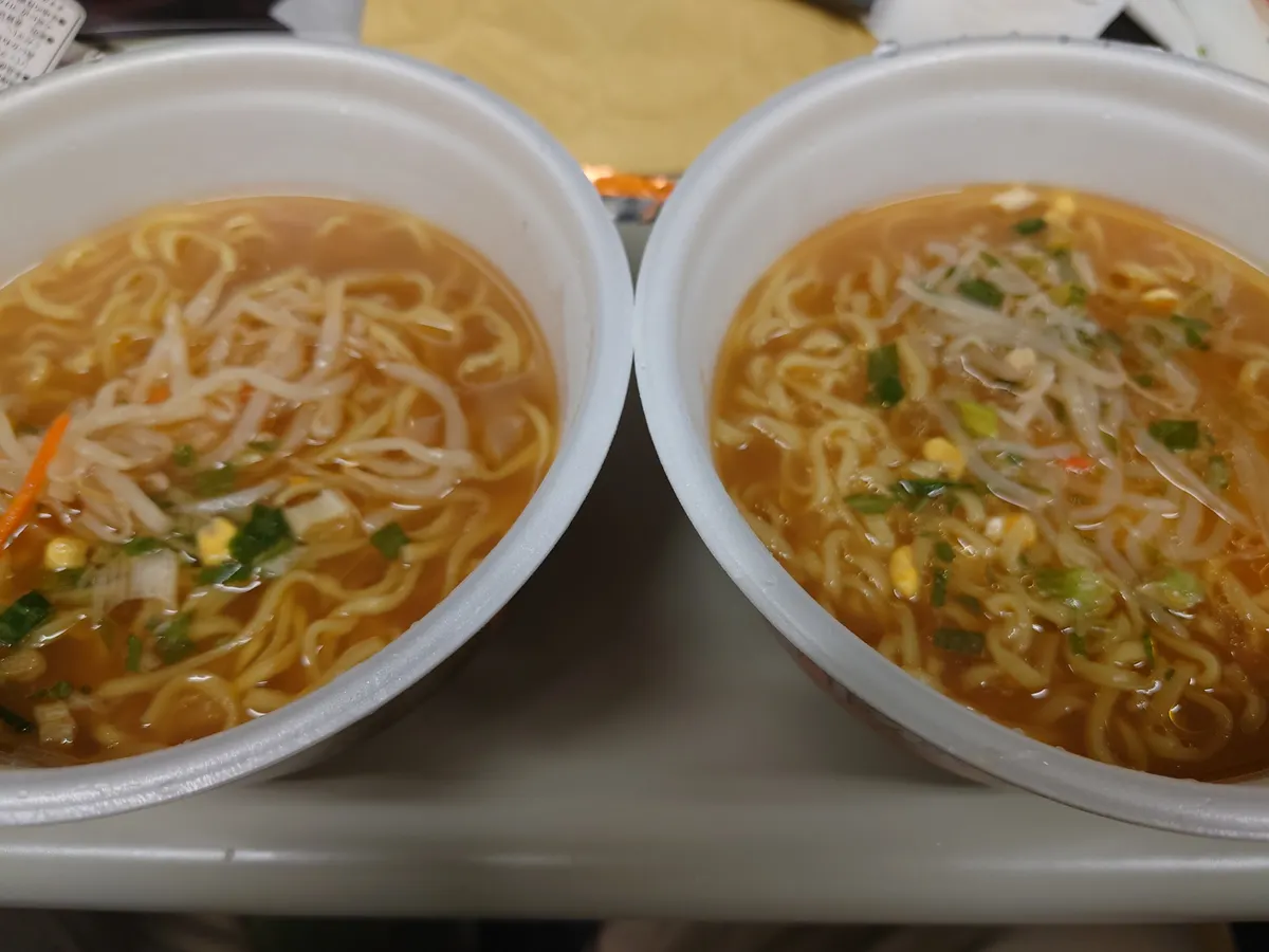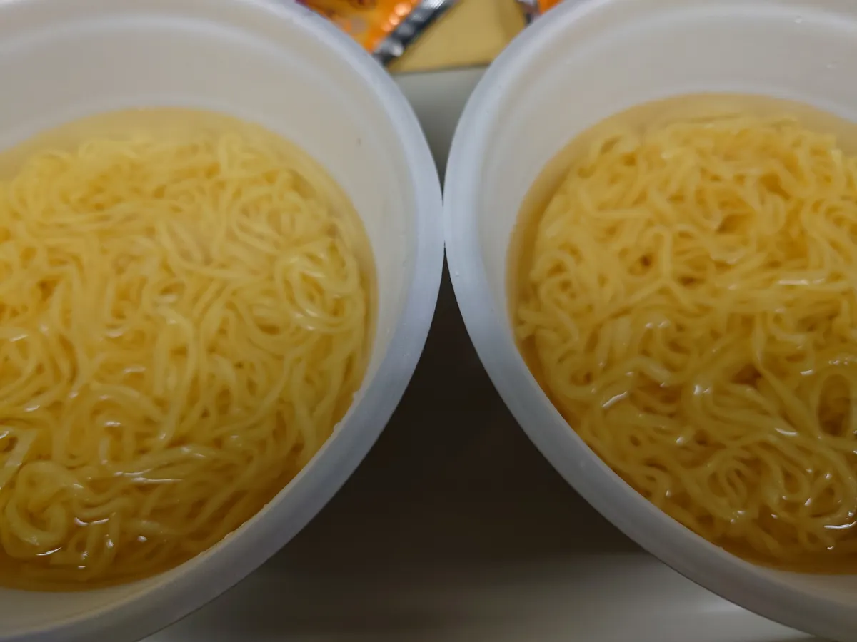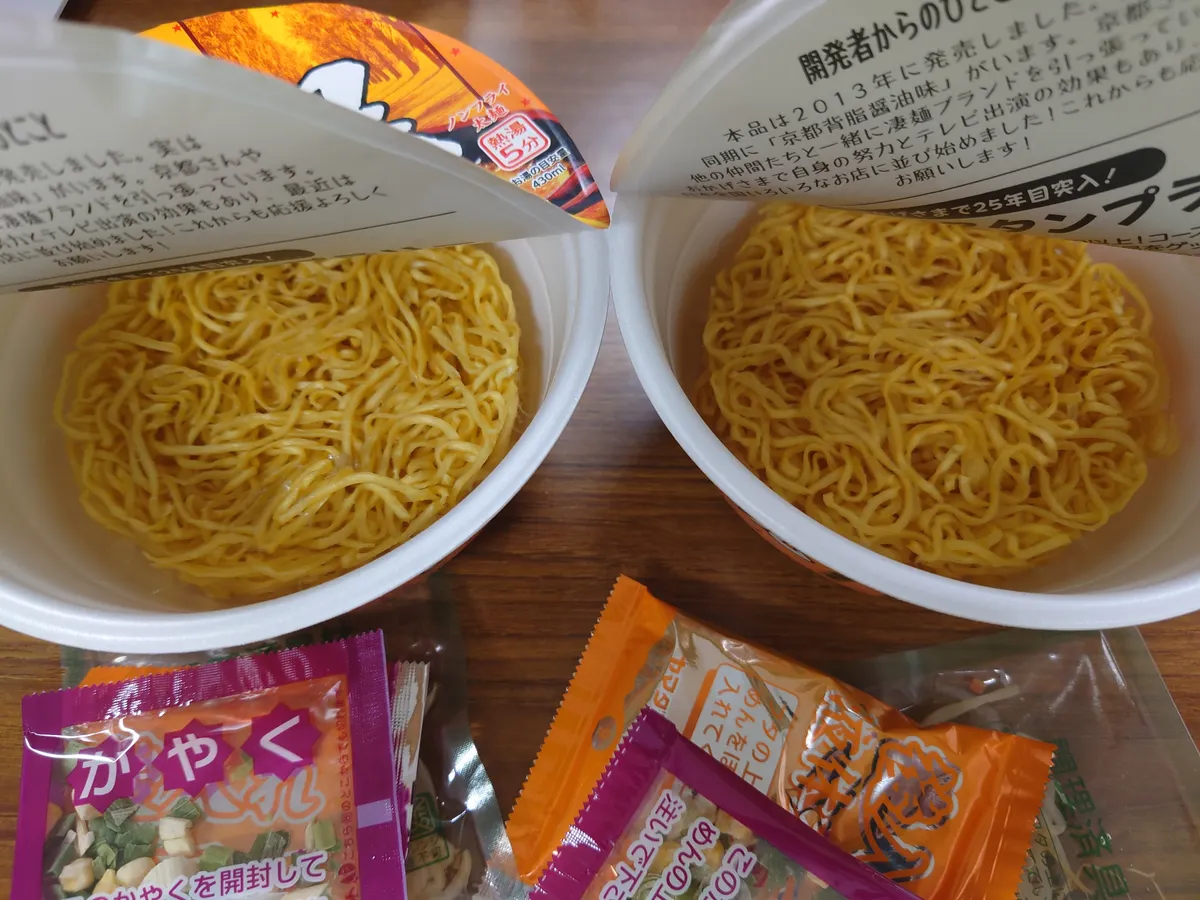 小袋を全部投入して交互にわしわしいただきます。すると、旧の方はぷっつり噛み切れるけど、新の方は弾力があるというか、モチモチした歯ごたえ。一気に完食してしまいました。塩分摂取量が大変なことになってますが、食べ比べて分かりました(ヤマダイさんの思惑と同じかどうかは分かりませんが )。