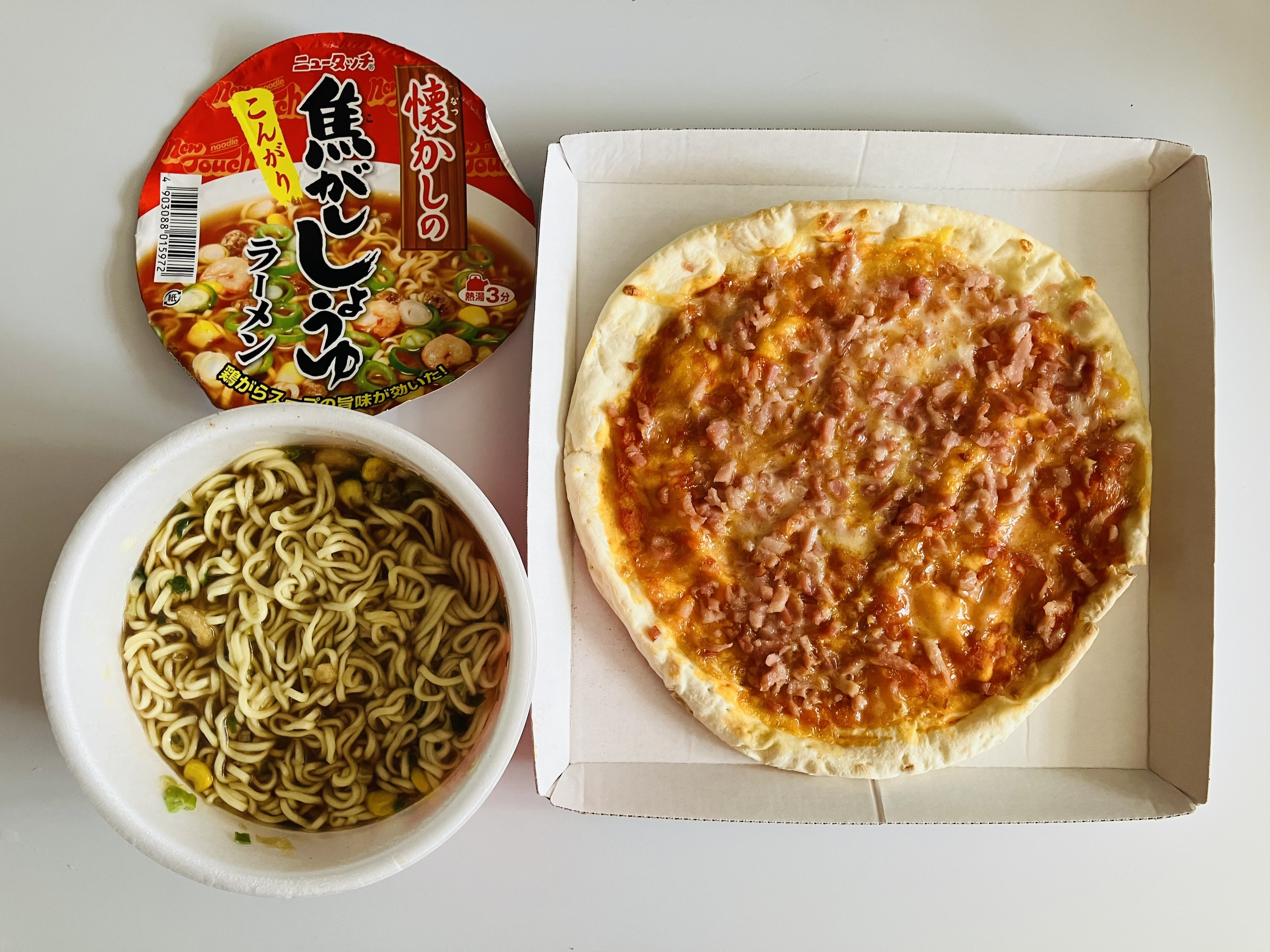 懐かしの焦がししょうゆラーメンとチルドピザ