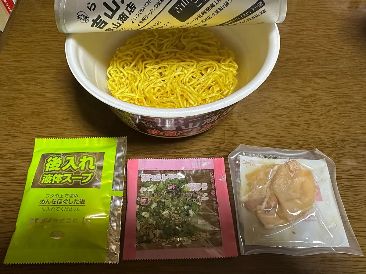 レトルトチャーシュー、その他かやくにスープ。熱湯5分ですね。