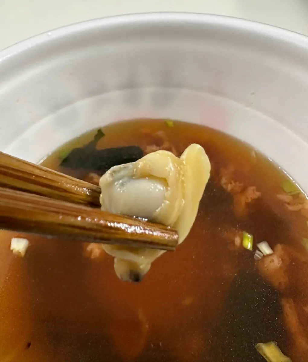これは先入れしておいたむきアサリ。たまに入っていません!とか仰る方がいますがスーパーの別売り品です。ワカメにエビが入ってるなら海鮮OK?と投入しましたが、麺をほぐしている間に全部沈没してしまいました😅15個くらいは入れたと思います。
