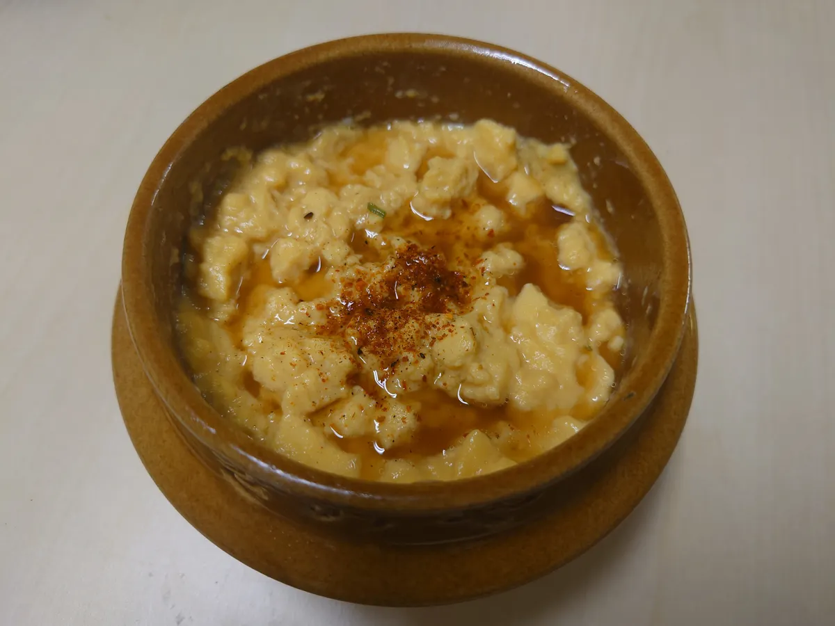 職場だとできることが限られるので、冷蔵庫にあった玉子にスープを入れてよーく混ぜてからレンチン。茶碗蒸しのようになるかと思ったけど、何か違う。でも食べたことがある。
