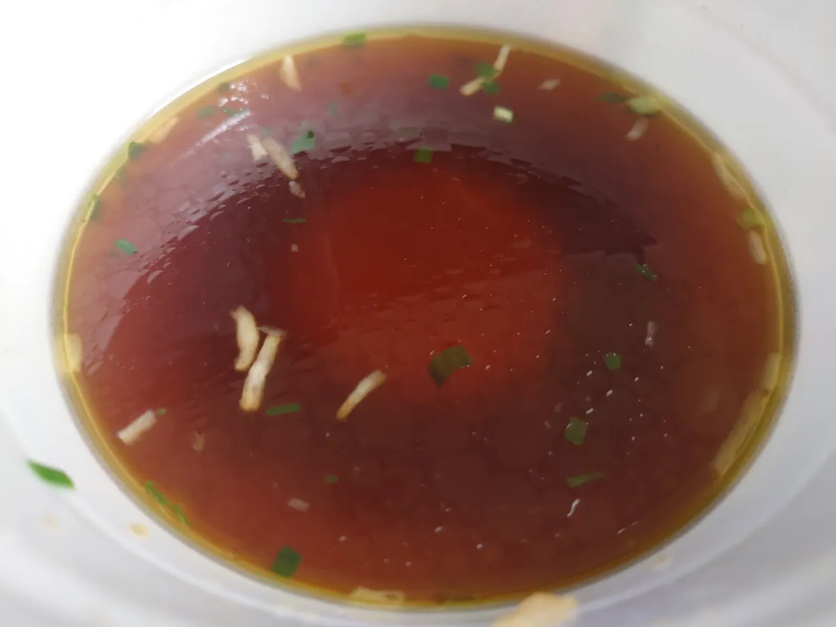最初にスープを一口。口のまわりが油でコーティングされる感じ。