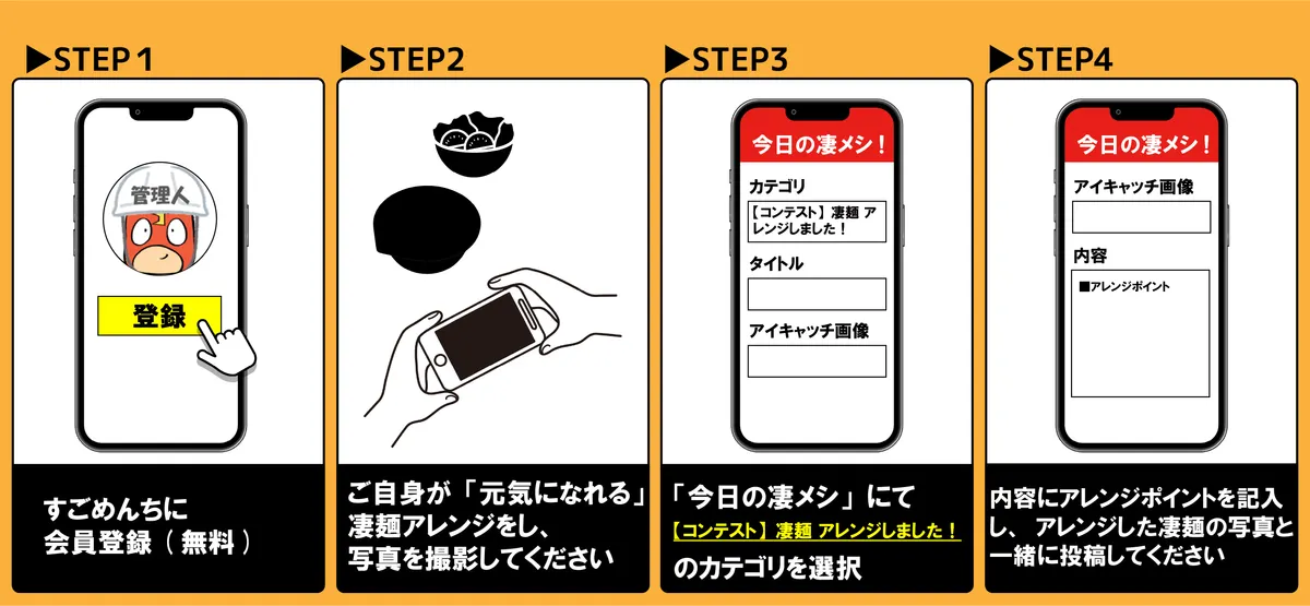 ④内容にアレンジポイントを記入し、アレンジした凄麺の写真と一緒に投稿してください