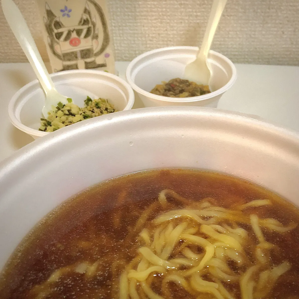 この素ラーメンに、悪魔やくみ、さらに味変用に冬の塩の白菜とスタミナトッピングを使った特製ペーストを、適宜、追加😁