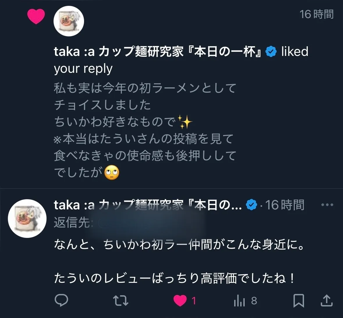 taka:aさんもちいかわ初ラー仲間だったので