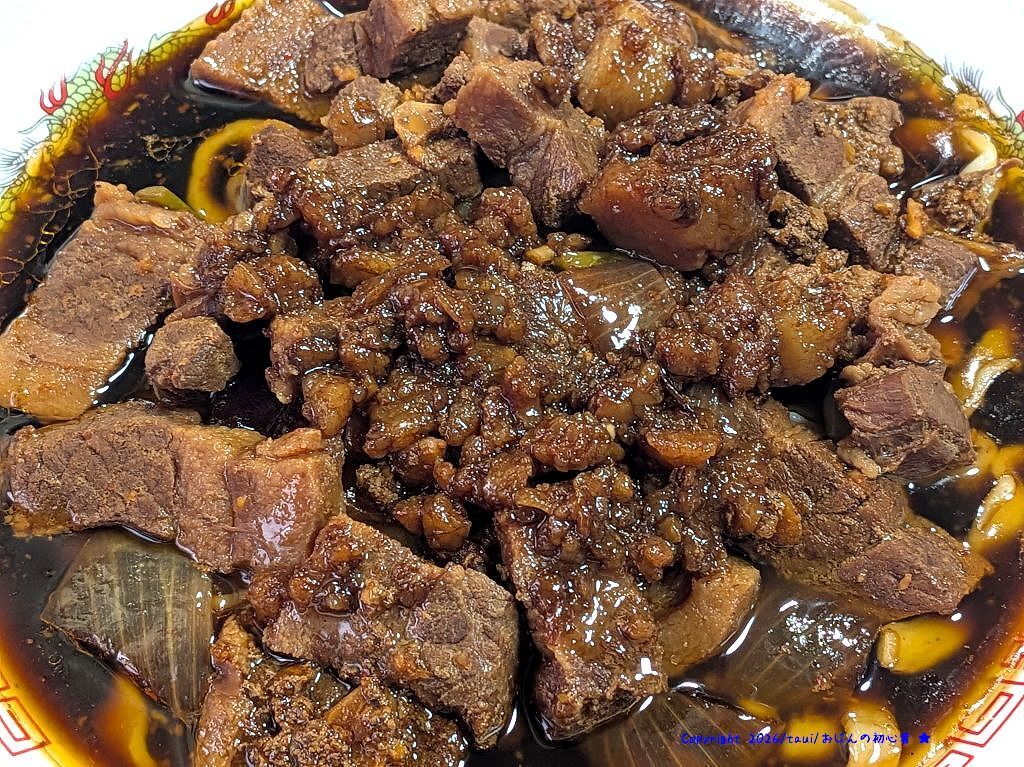 具は豚バラブロックの角切り肉や玉ねぎ、ニラなど・・・でもほとんど肉ですww