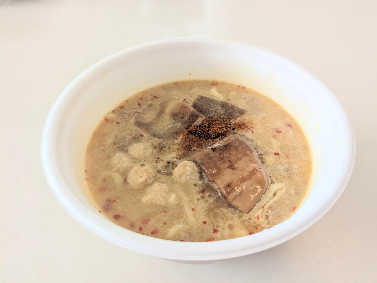 具材はとにかくひときわ存在感のある角煮チャーシュー、優しいお醤油の風味がきちんとしみてトロトロの脂身としっとりした肉感を感じられる。鶏団子はホロホロとスープに馴染む安心の味。謎肉的大きめ肉そぼろは味のアクセントに。
