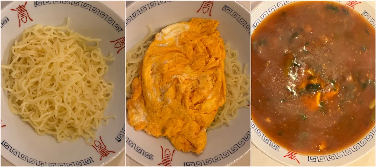 ・餡掛けタレっぽくするため水は少し少なめ350ml程度、かやくと特製スタミナたれを入れて沸騰させ、後入れ粉末スープを加えてかき混ぜる。好みで醤油、一味を加えて、最後にとろみ調整で水溶き片栗粉を加えてよくかき混ぜる