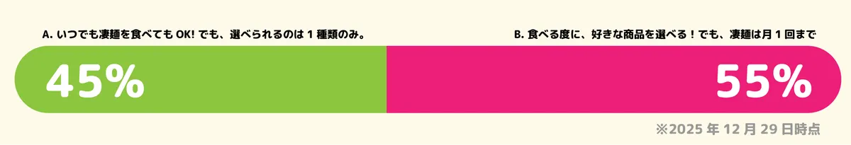 Aを選んだ方からは「1か月に1回しか食べれないのはつらいから」「たくさん食べられるAにしました!」という声が多く見られました。一方、Bを選んだ方からは、「我慢してでも色々な種類の凄麺を食べたい!」という声が多く見られました。