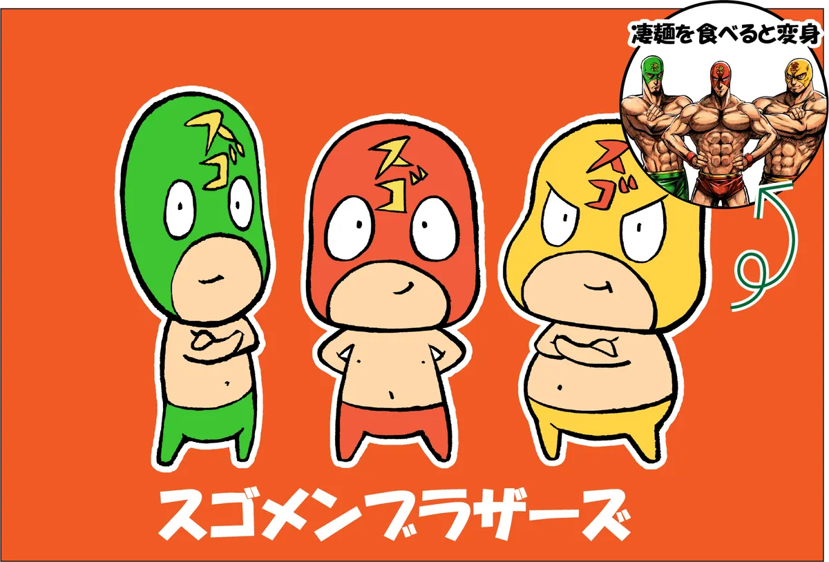 さらにこの年、もうひとつの大きな企画として誕生したのが、今やすごめんちに欠かせない存在となっている、凄麺のキャラクター 「スゴメンブラザーズ」 です🔥