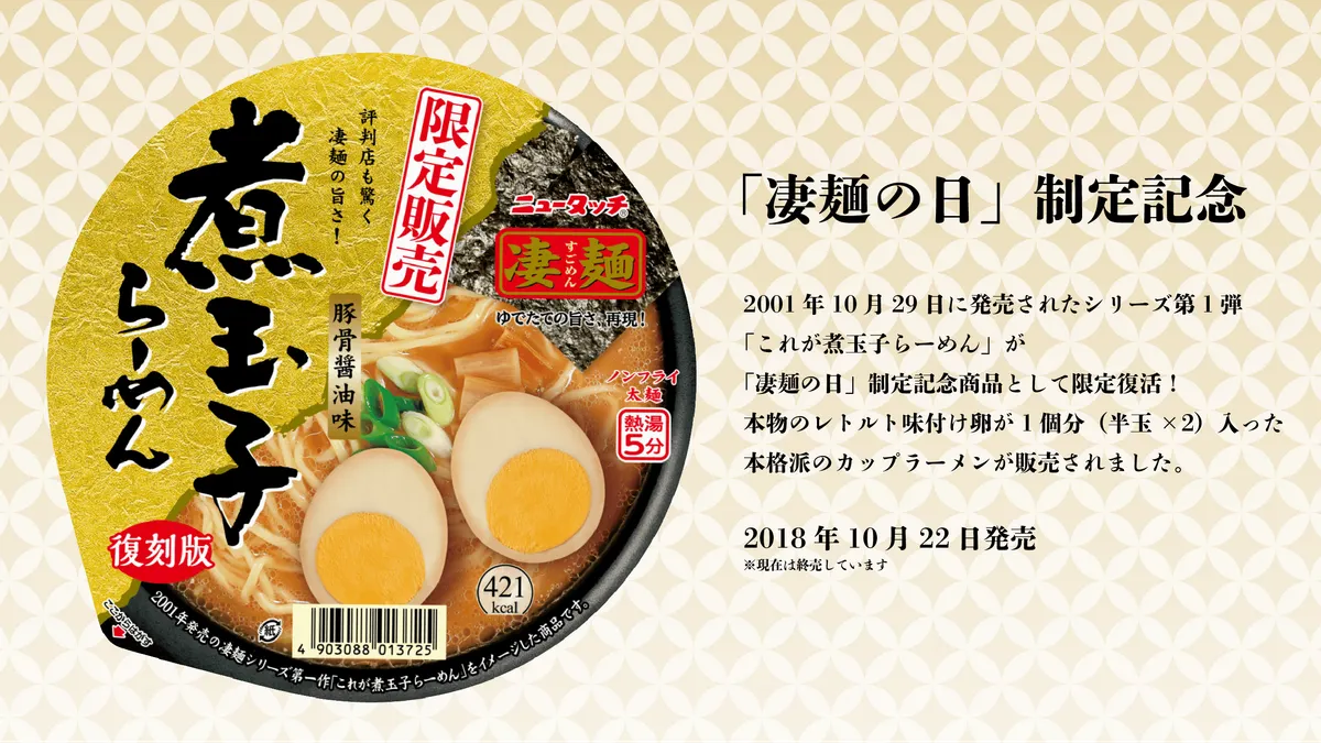 2018年には、「凄麺の日」を制定した記念企画として、第1号商品を復刻した「凄麺 これが煮玉子らーめん 」 も期間限定で発売🍜