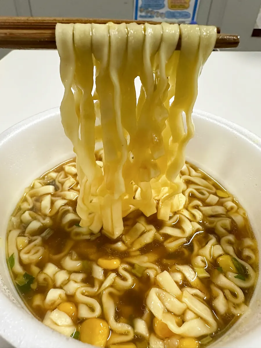 接写ぎみだから多少太く見えますね。これけっこう美味いです。口に運んだら麺の下側を箸で押さえながら食べましょう。勢いよく啜るとあっちこっちに飛びハネます😅