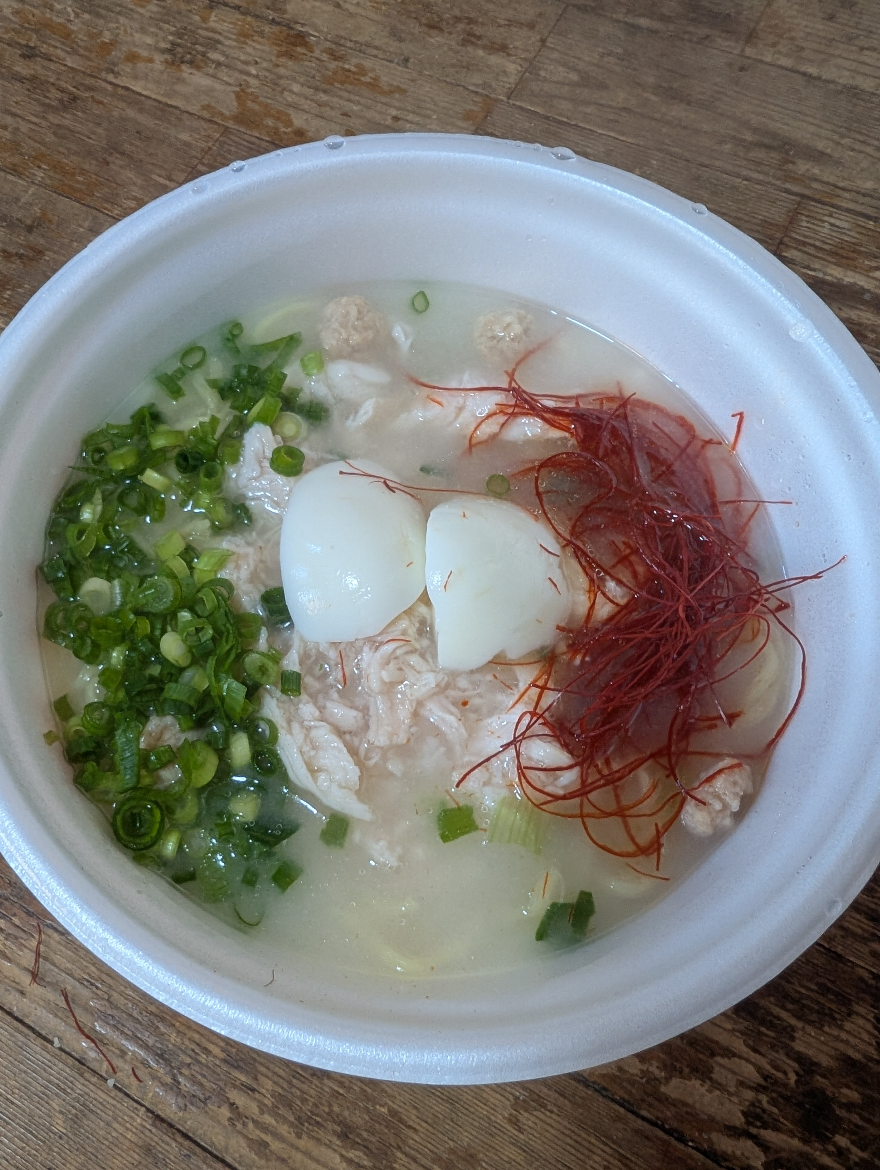 ちなみに今回使用したむね肉はコンビニさんでフツーに売られてるサラダチキンでした。京都伏見酒粕ラーメンのスープとの調和性を保つ為にプレーンを使用しました。