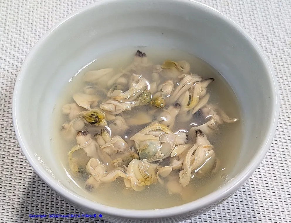 煮汁はスープの沸かし湯に混ぜ込み、むき身は最後にトッピングします