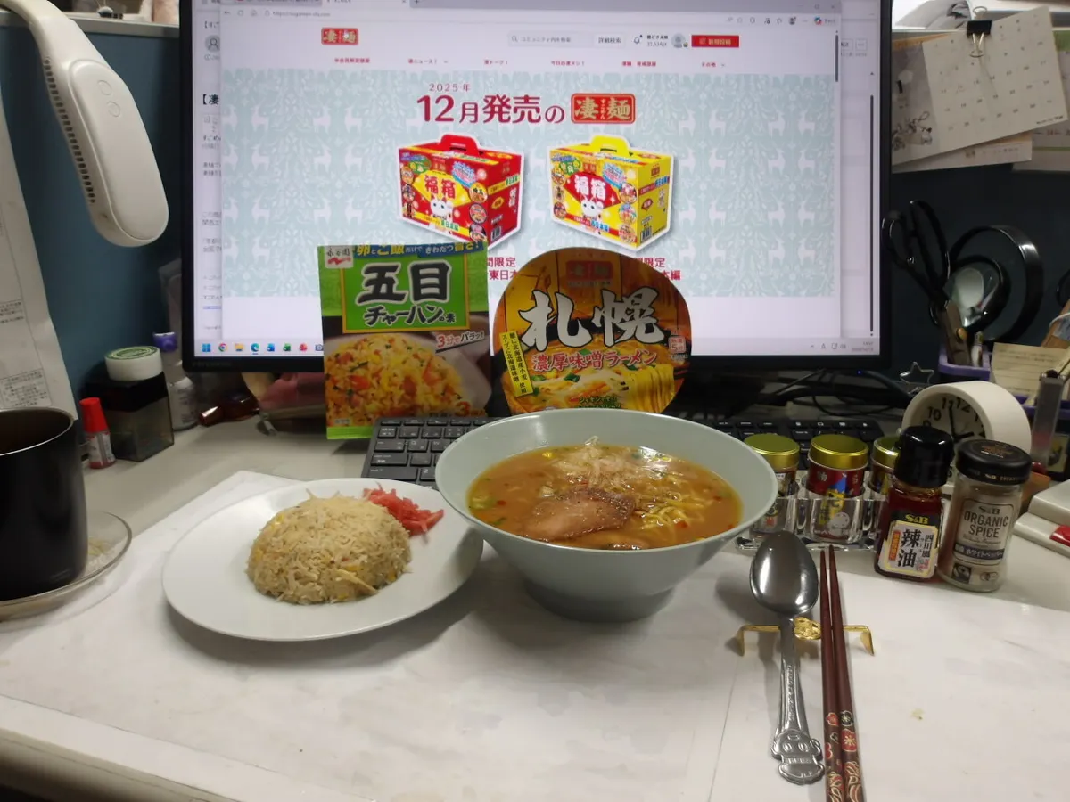 トップ > 今日の凄メシ! > 凄麺 食べました! > ランチ定番「半チャンラーメン」 勝どき太郎 2025/12/13 14:19 ランチ定番「半チャンラーメン」 今日は時間があり・・「半チャーハン」にTRyしました。 ご飯を炊いて鳥や豆を卵とチャーハンの素で混ぜて・・(お米はバスマティライス) トッピングは焼き豚のみ!! 多少時間が掛かりましたが、「半チャーハン」 会社で作る事が 万歳 さて味は 寒いときには味噌 いい味・麺(太さ)の絡みが「凄麵」 そしてチャーハンこの組み合わせが サラリーマンのランチ定番です。 次回はナポリタン?? では (^_-)-☆ スゴ活 いいね 共有する 共有する X facebook LINE リンクをコピー コメントする 4 件の返信 (新着順) ミュートしたユーザーの投稿です。 投稿を表示 とはる 2025/12/14 17:03 勝どき太郎さん 半チャンセット最高ですね!! 会社の事務所で作るクオリティではない気がします~ いいね 返信する ミュートしたユーザーの投稿です。 投稿を表示 ミック 2025/12/14 10:07 美味しそうなランチ半炒飯ラーメンですね 炒飯が会社で作れるのもすごいですね 寒い時の味噌もおいしいですね いいね 返信する ミュートしたユーザーの投稿です。 投稿を表示 くろねこ 2025/12/13 17:12 会社で作れる環境(堂々と!) 察しますが、羨ましいです! いいね 返信する ミュートしたユーザーの投稿です。 投稿を表示 あひるん 2025/12/13 14:34 今日の夕飯は播州ラーメンを食べるので、昨日の残りのご飯で少なめチャーハンを作って食べようと思います! いいね 返信する
