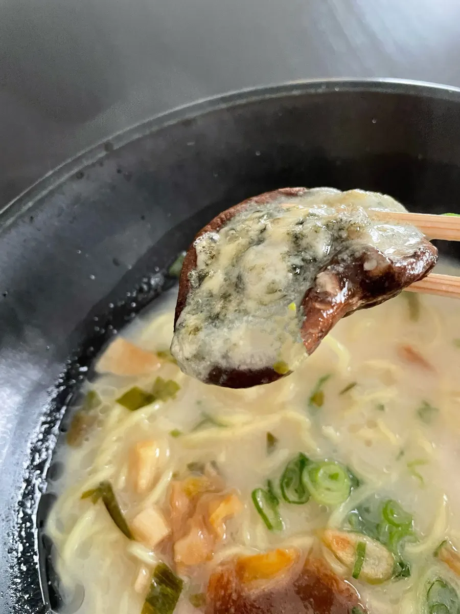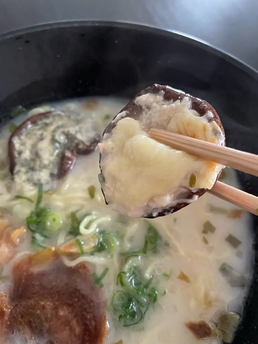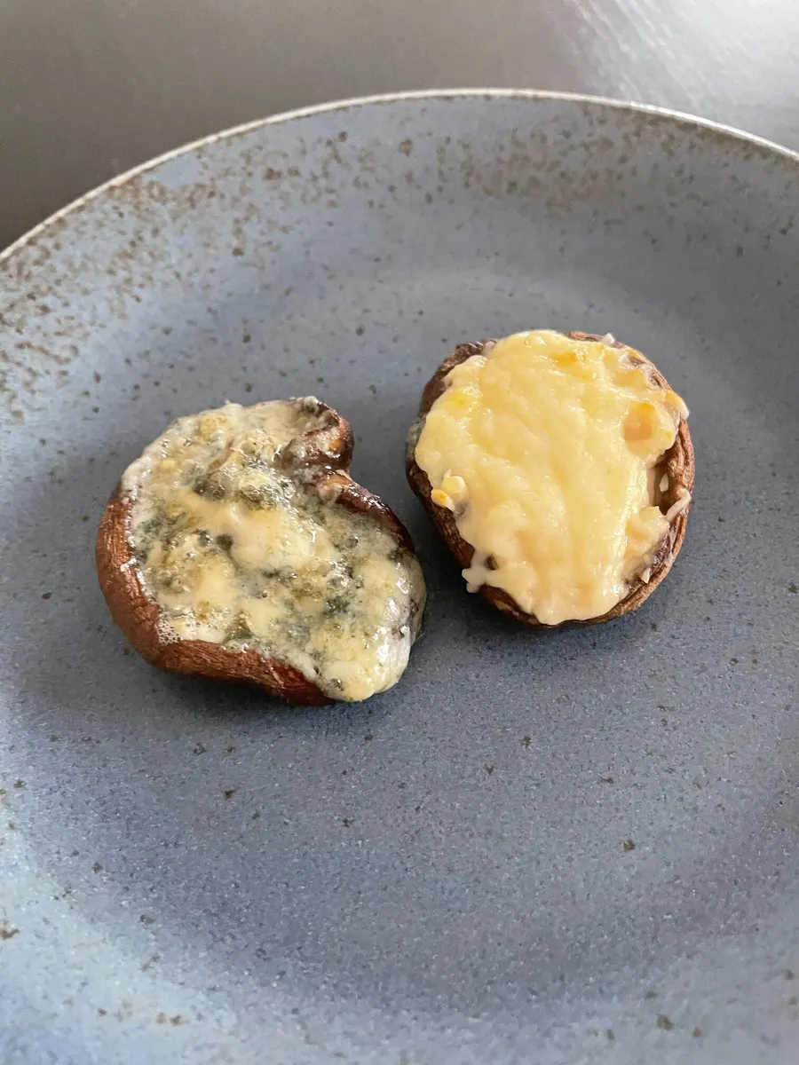 土台は椎茸。左はブルーチーズ、右は酒粕・豆乳・微量マヨを練り混ぜてピザ用チーズ掛け。それらをオーブントースターで4〜5分。