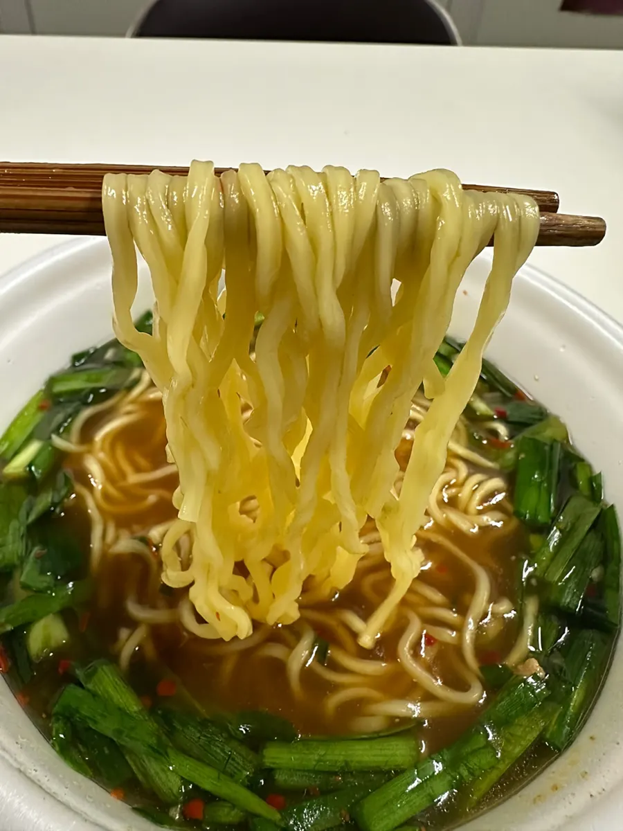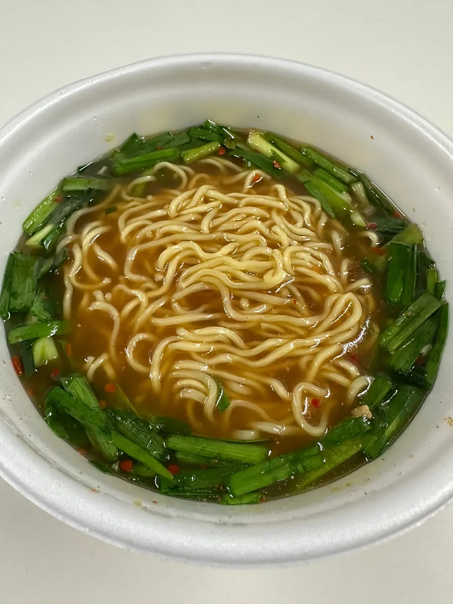 トロミのあるピリ辛スープで食べていると、まるで横浜の中華料理店で麺類を食べている気分ですが😄 追加したニラもマッチしてなかなか旨いです。