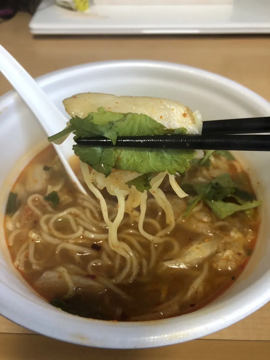 豆板醤とピリ辛醤油のさっぱりとした辛めのスープには、パクチーもよく合いますね~