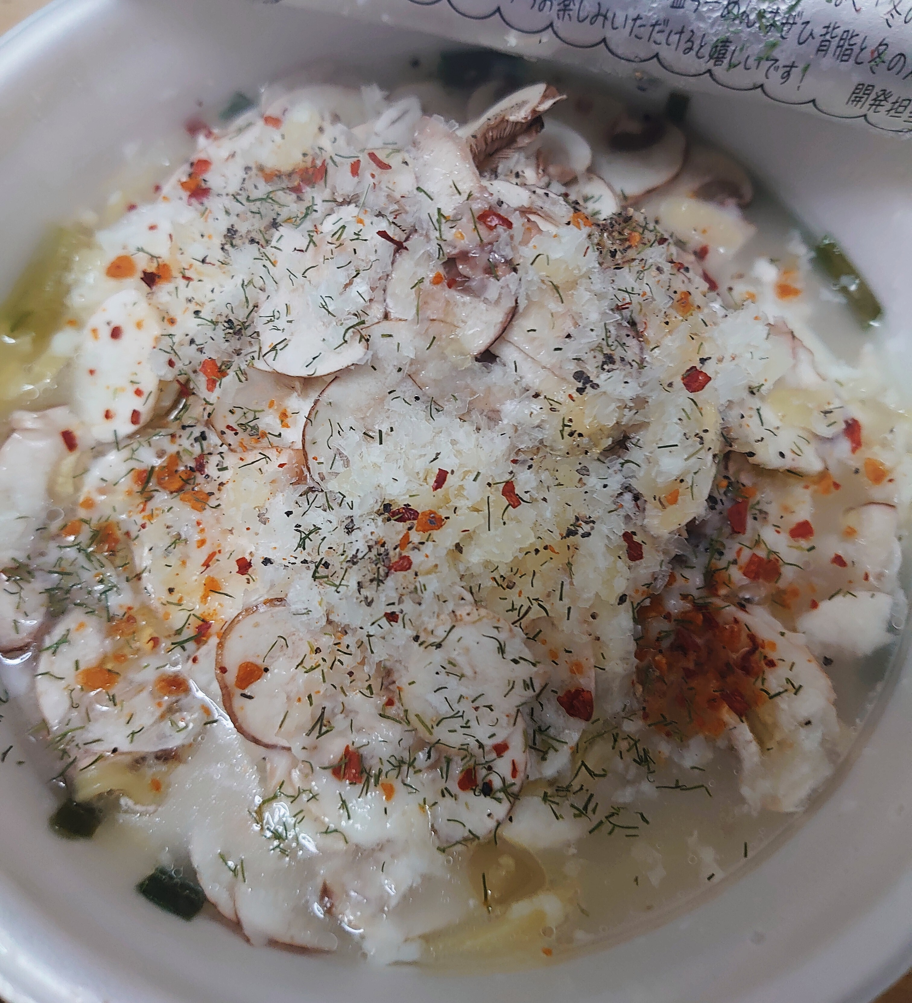 たっぷりマッシュルームの上に削ったチーズとオリーブオイルでイタリアンラ―メンな感じで最高でした!!