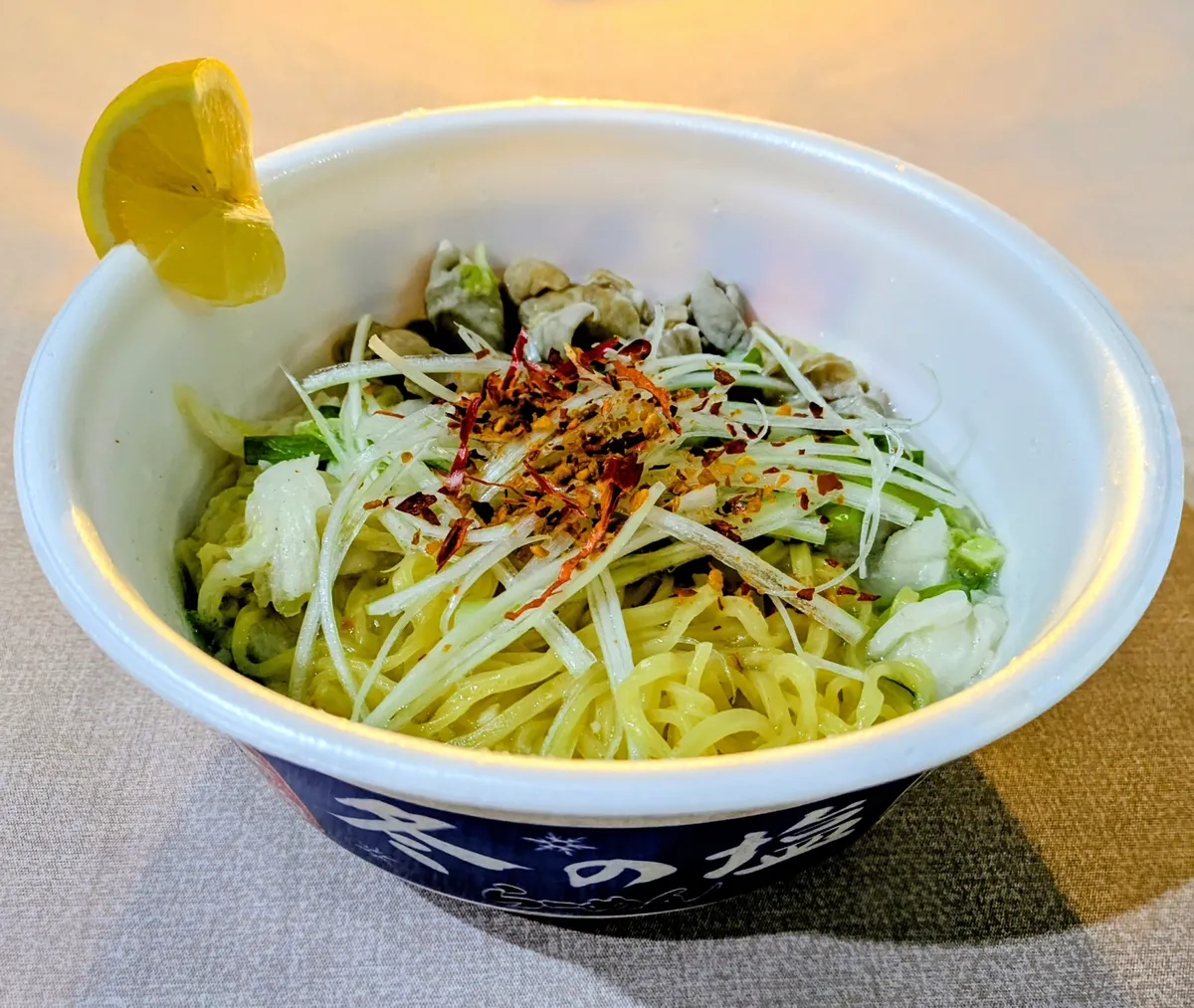 湯切りした麺に具材を乗せ、白髪ねぎ、冬のスタミナトッピングと唐辛子をちらし、レモンを添え