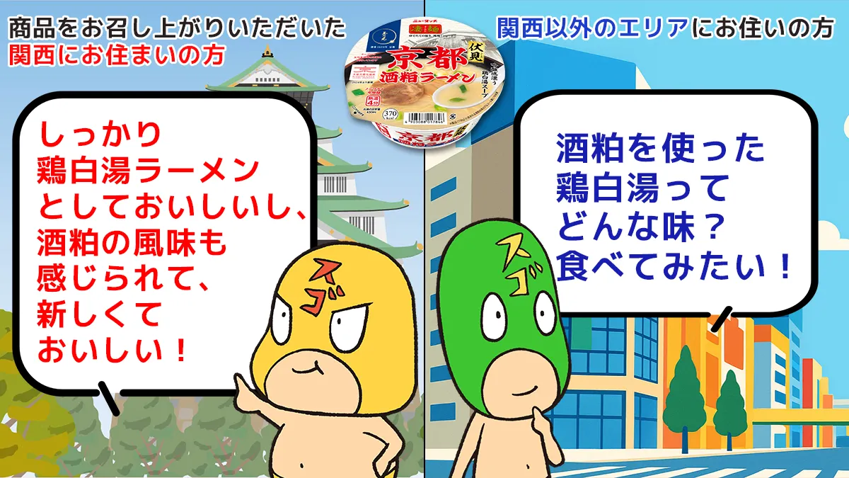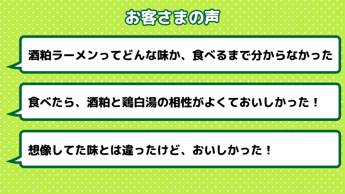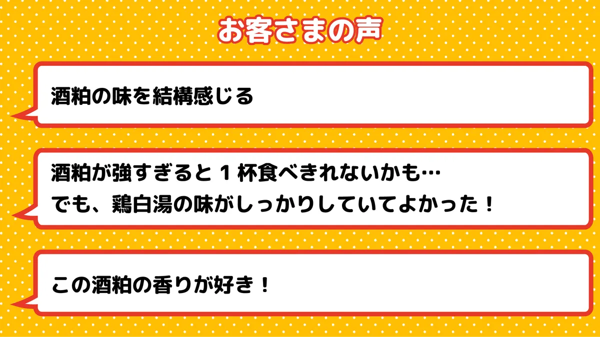 商品をお召し上がりいただいた関西にお住まいの方からは、「しっかり鶏白湯ラーメンとして美味しいし、酒粕の風味も感じられて、新しくて美味しい!」といった声、関西以外のエリアにお住いの方からは、「酒粕を使った鶏白湯ってどんな味?食べてみたい!」といった声が、たくさん寄せられていました。