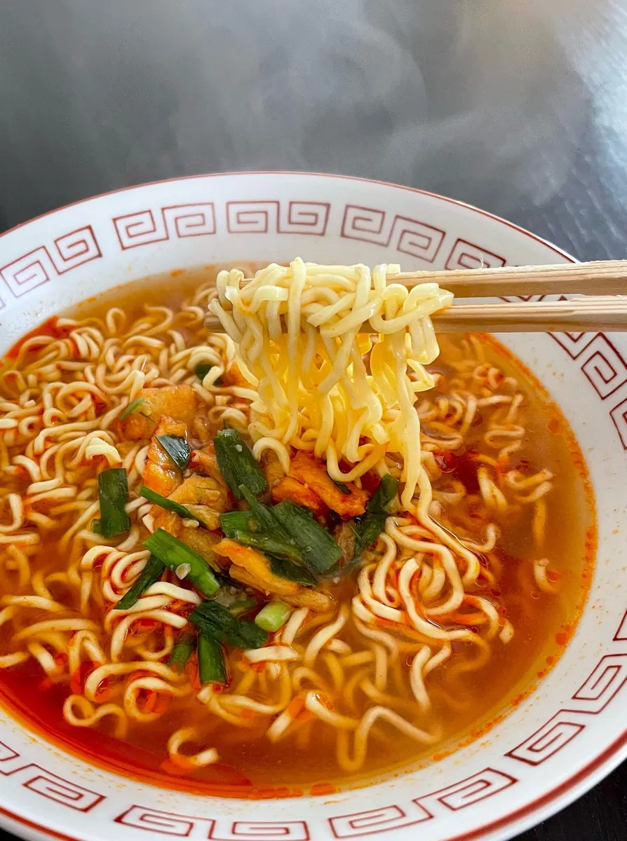 粉末スープに入っているキムチパウダーが効いていて、白菜キムチを食べるまでもなくしっかりキムチ実感が得られます。そしてさらに調味オイル、これがピリッとしてけっこう辛い!
