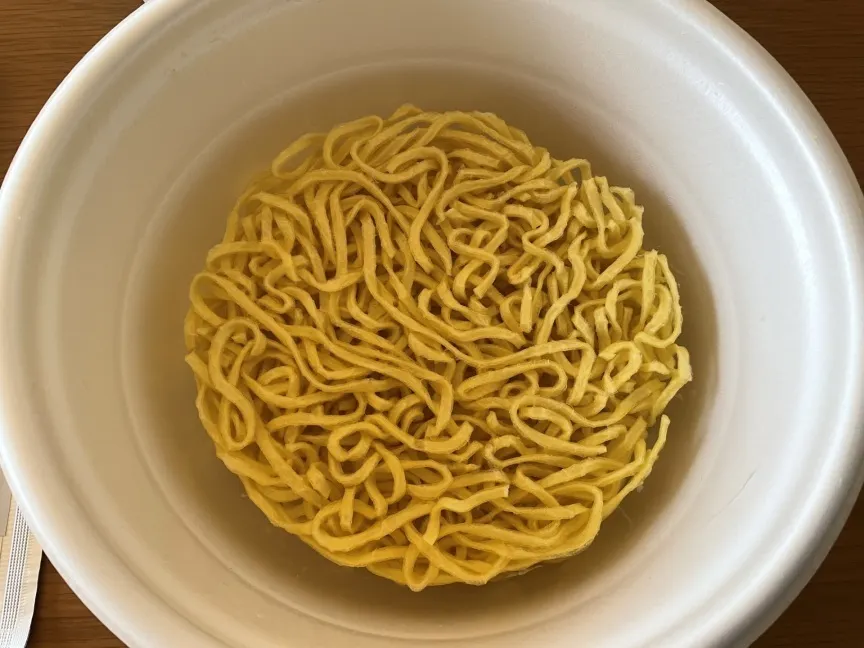 粉末スープを溶いている間にカレーの風味が広がります。いい香り、お蕎麦屋さんで先客がカレーうどんを食べていると思わずカレーうどんを注文しちゃう、あの感じ...期待が大きく膨らみます。