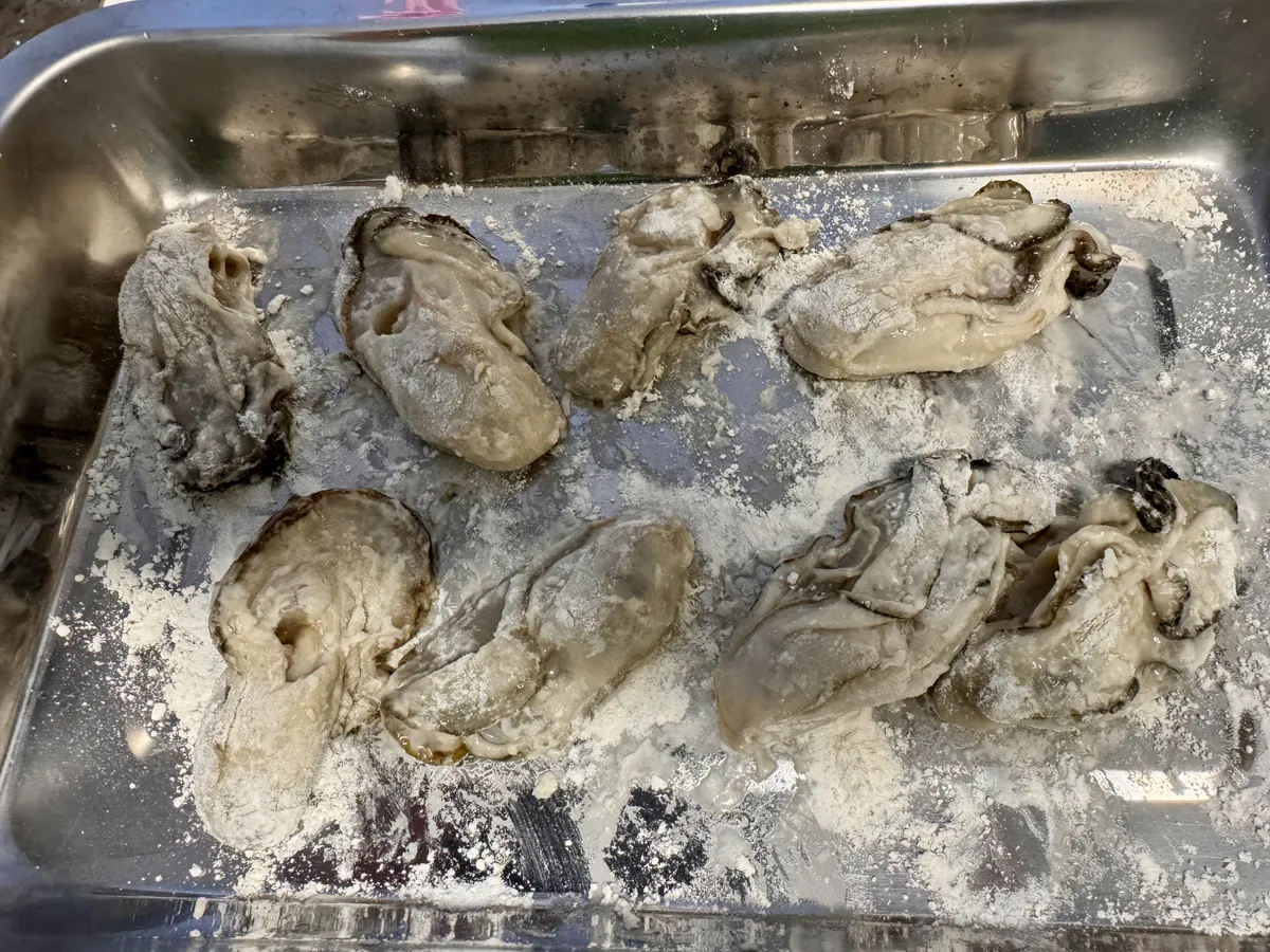 水洗いした牡蠣の水気を切り、片栗粉もしくは小麦粉を振りかけます。