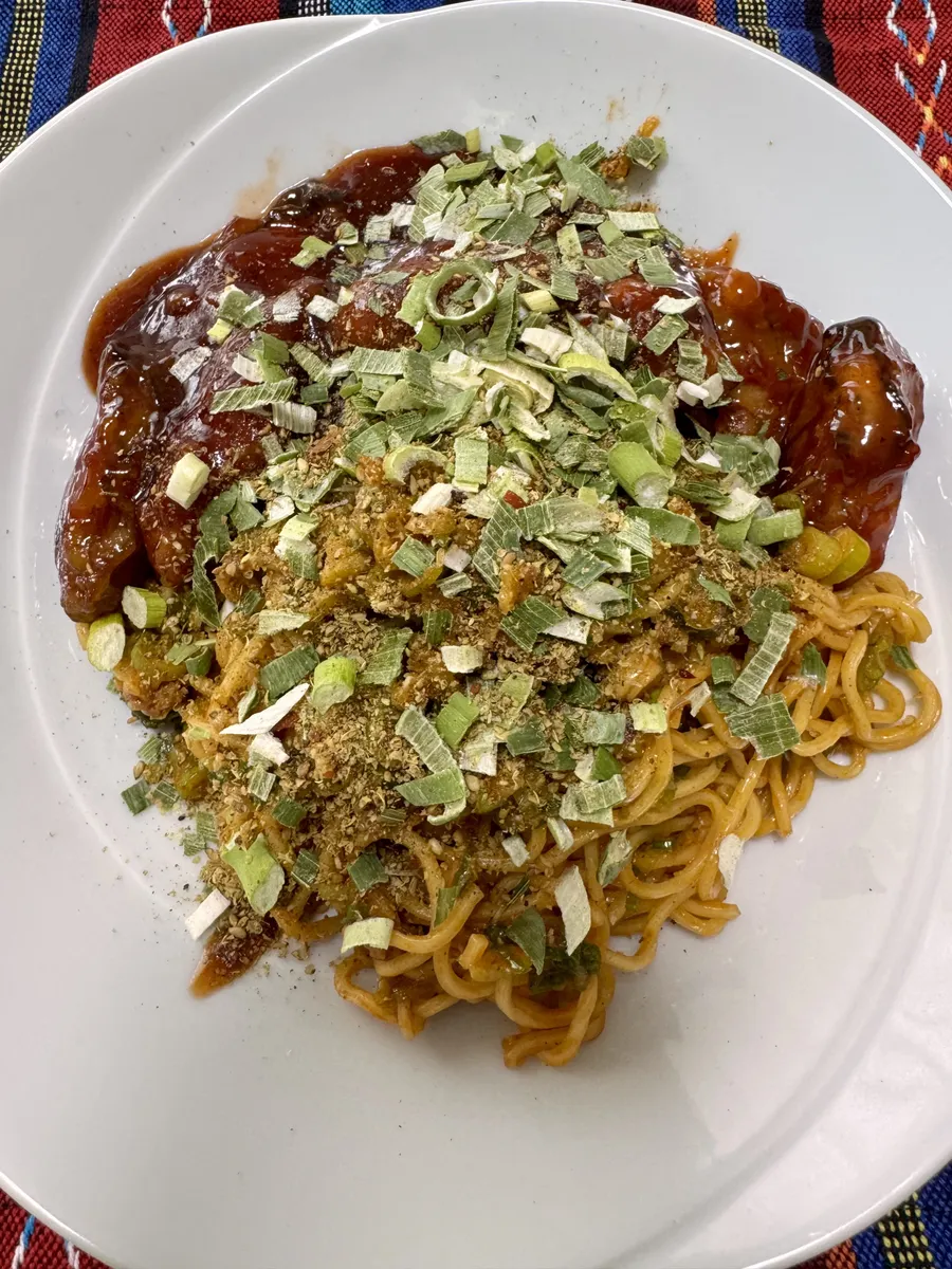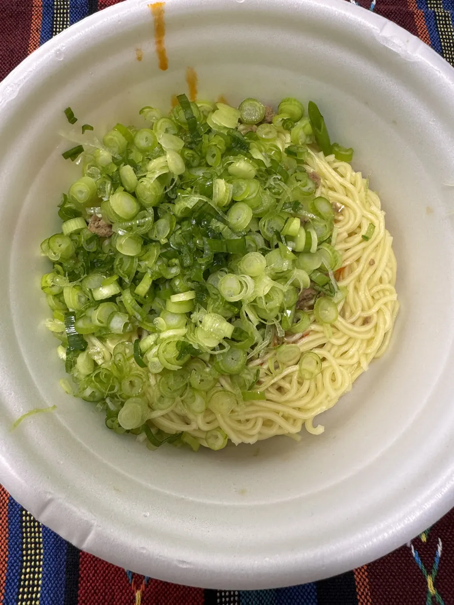 盛り付けた汁なし担々麺に牡蠣チリを盛り付けます。最後に後乗せかやくを振りかけて出来上がりです。