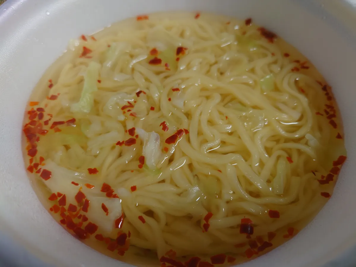 ほかの方の投稿で知っていましたが、かやくに唐辛子が入っています。なので、5分後でこの状態。