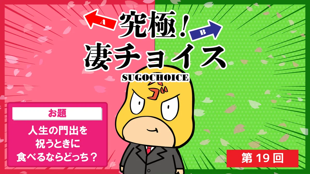 | 「究極!凄チョイス!」は 凄麺やグルメにまつわる"こんなの選べない!"という究極すぎるお題に対して 自分だったらどの選択をするのか、みなさんに投票していただく企画です。 |