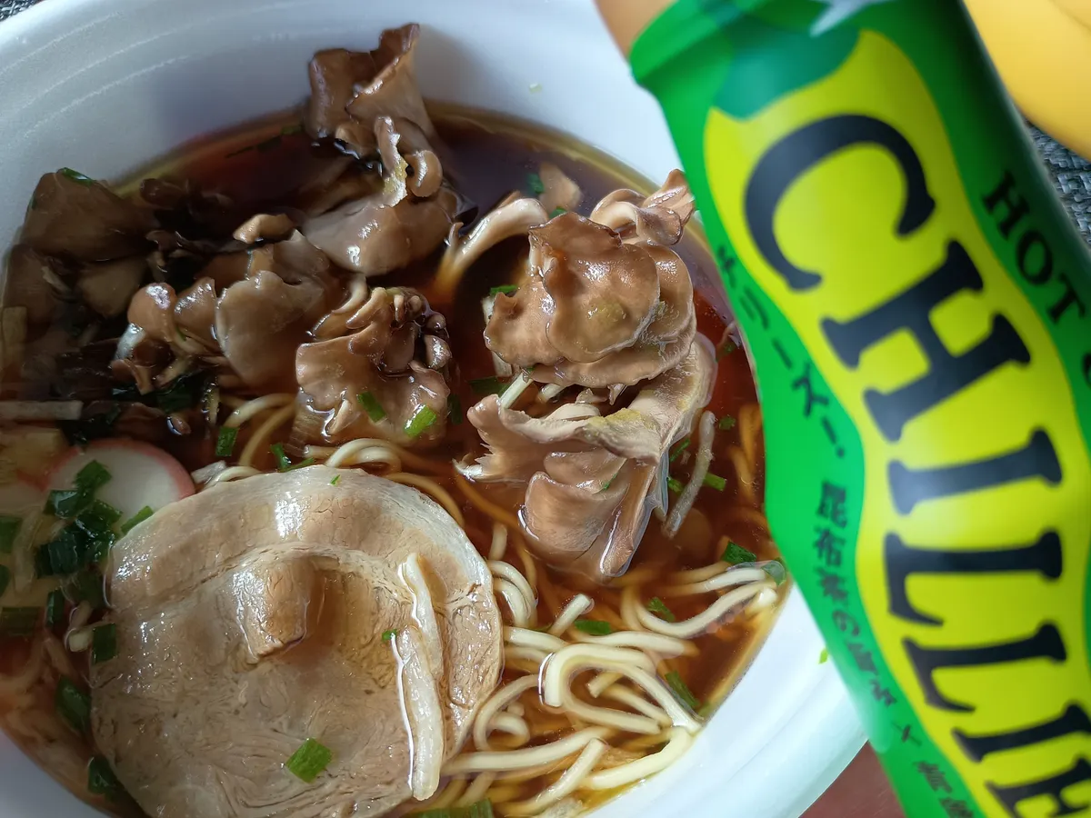◆アレンジポイント 今は、きのこが高くなりましたが、昔、舞茸のヘルシーさでよく食べてました。レンチンしたものをまるまるのせました。これをほぐしてスープにつけても少し物足りないので、さらに唐辛子ソースを。こちらは、本当にヘルシーな唐辛子ソース、昆布茶の旨みと青唐辛子のアクセントでカロリーも低め。ベジファーストなので、レンチンした舞茸を先頭に食べながら、ラーメンと一緒に美味しく食べすすめ…