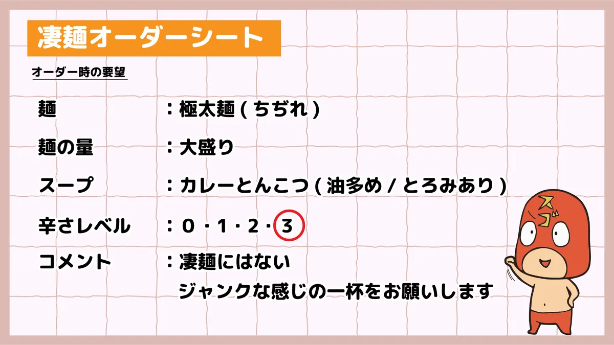 ちなみに、「濃厚とんこつカレーラーメン」のオーダー内容は以下の通りでした。