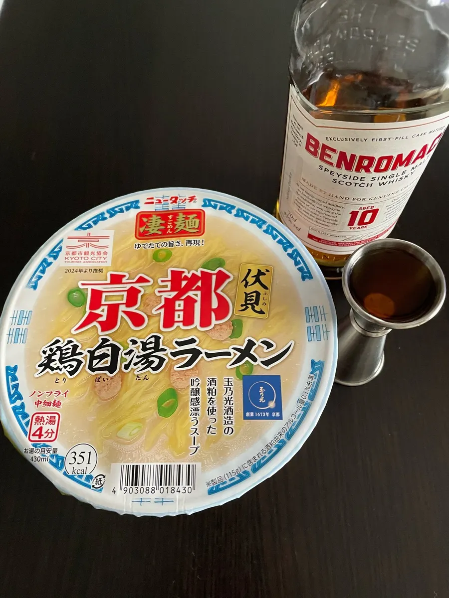 一応レポートさせていただきますと、グラデーションの濃い所はもろにウイスキーテイストです。麺をすするとき気をつけないとむせ返りそうになります。全体に浸透したあとはコクが増すというか鶏白湯酒粕の塩味が持ち上がって独特の深い味わいが楽しめます。いつものように完食完飲。身体も気持ちもポカポカ😊何回かに1回はこれでもいいかなと思うくらいです。ウイスキー好きの方は試してみてはいかがでしょうか。ただ、他の凄麵(特に醤油や味噌)ではやらない方がいいかも・・・