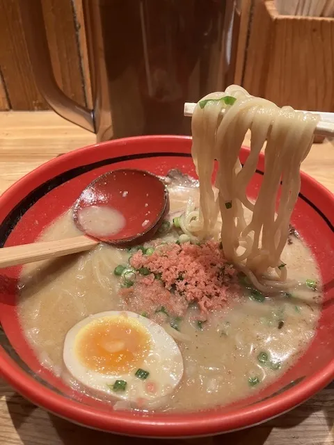 えびの風味と豚骨スープとのバランスが心地よく、太麺によく絡まりたいへんおいしかったです😄