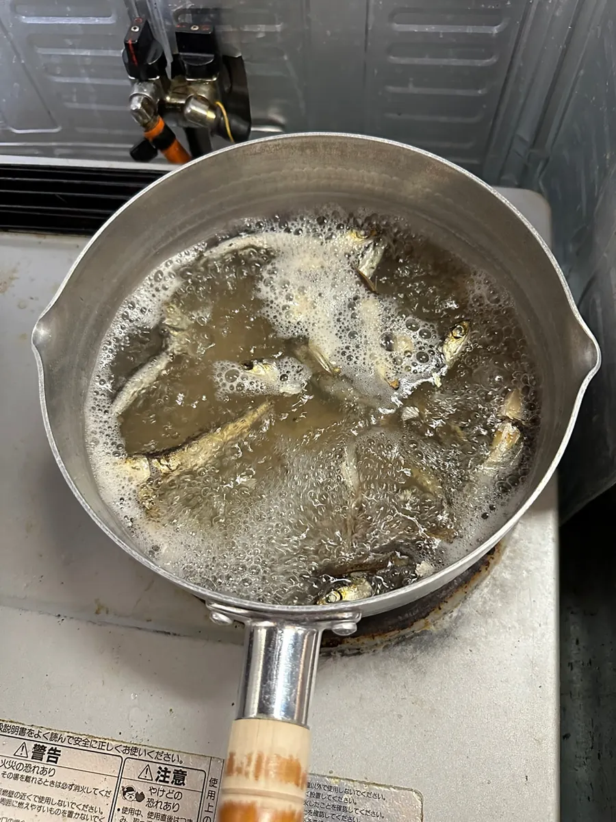 まずは出汁を取りましょう。煮干し20匹くらい?鰹節は一握りで。あー、でも私は手がデカいからな😅 まあ、ビミョーなところはお好みで。