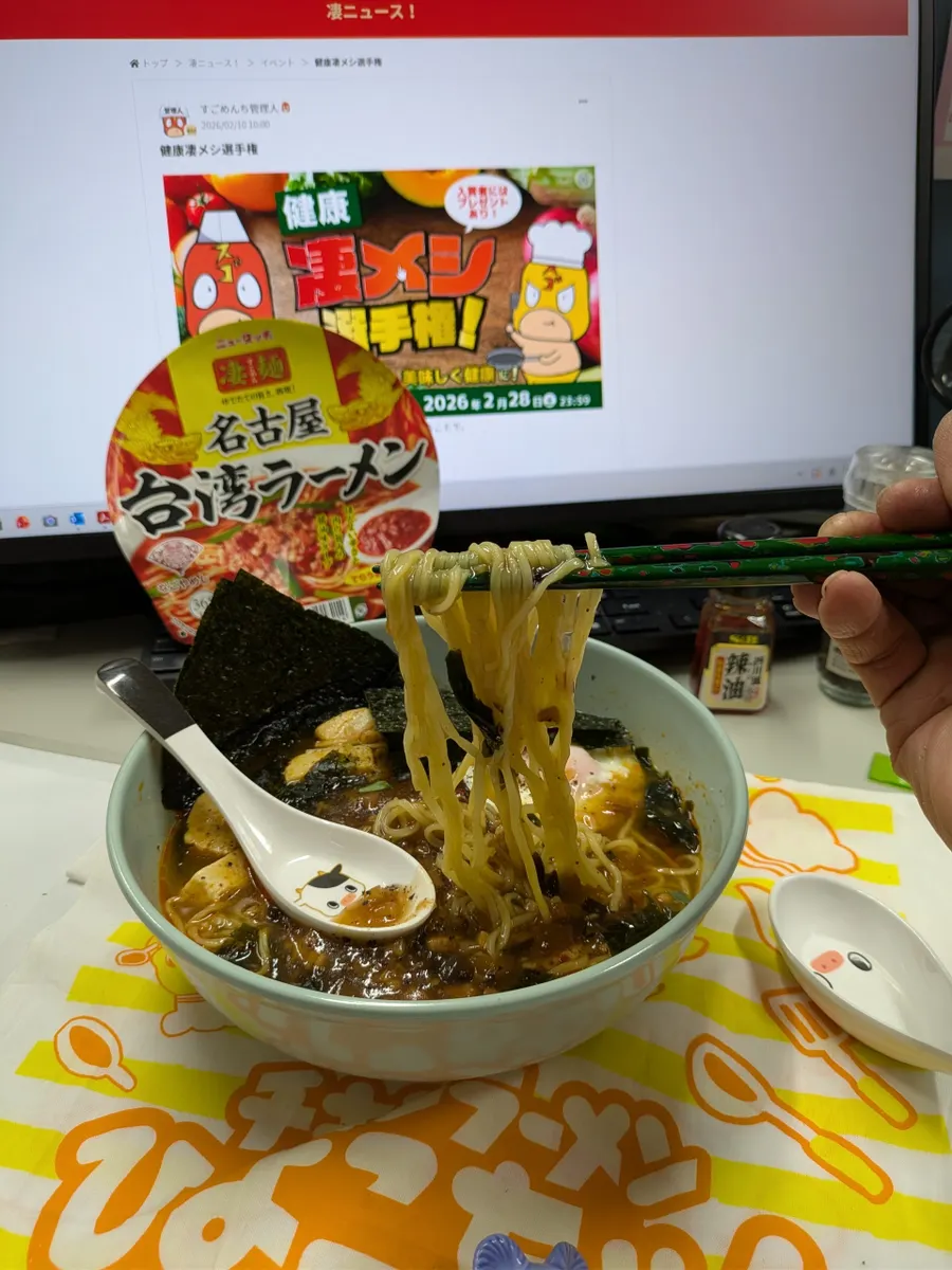 トップ > 今日の凄メシ! > 【コンテスト】凄麺 アレンジしました! > 台湾コラボ 勝どき太郎 2026/02/28 18:26 台湾コラボ 商品名:名古屋台湾ラーメンアレンジポイント 台湾商品のコラボを企画 名古屋ラーメン+ルーロー飯 馬告(スパイス) この3点でコラボしました。 トッピング:凍り豆腐+わかめ+海苔+玉子 広島(汁なし)も検討しましたが・・・コラボ重視です。 味は初めはルーローの甘さと後から来る辛さ 75点ぐらいの美味しさで 満足しています。 間に合った!! 企画物 (^_-)-☆ スゴ活 いいね 共有する 共有する X facebook LINE リンクをコピー コメントする 1 件の返信 (新着順) ミュートしたユーザーの投稿です。 投稿を表示 クロネコ 2026/02/28 19:19 にゃああんっ😸的なのは海苔ですか? いいね 返信する