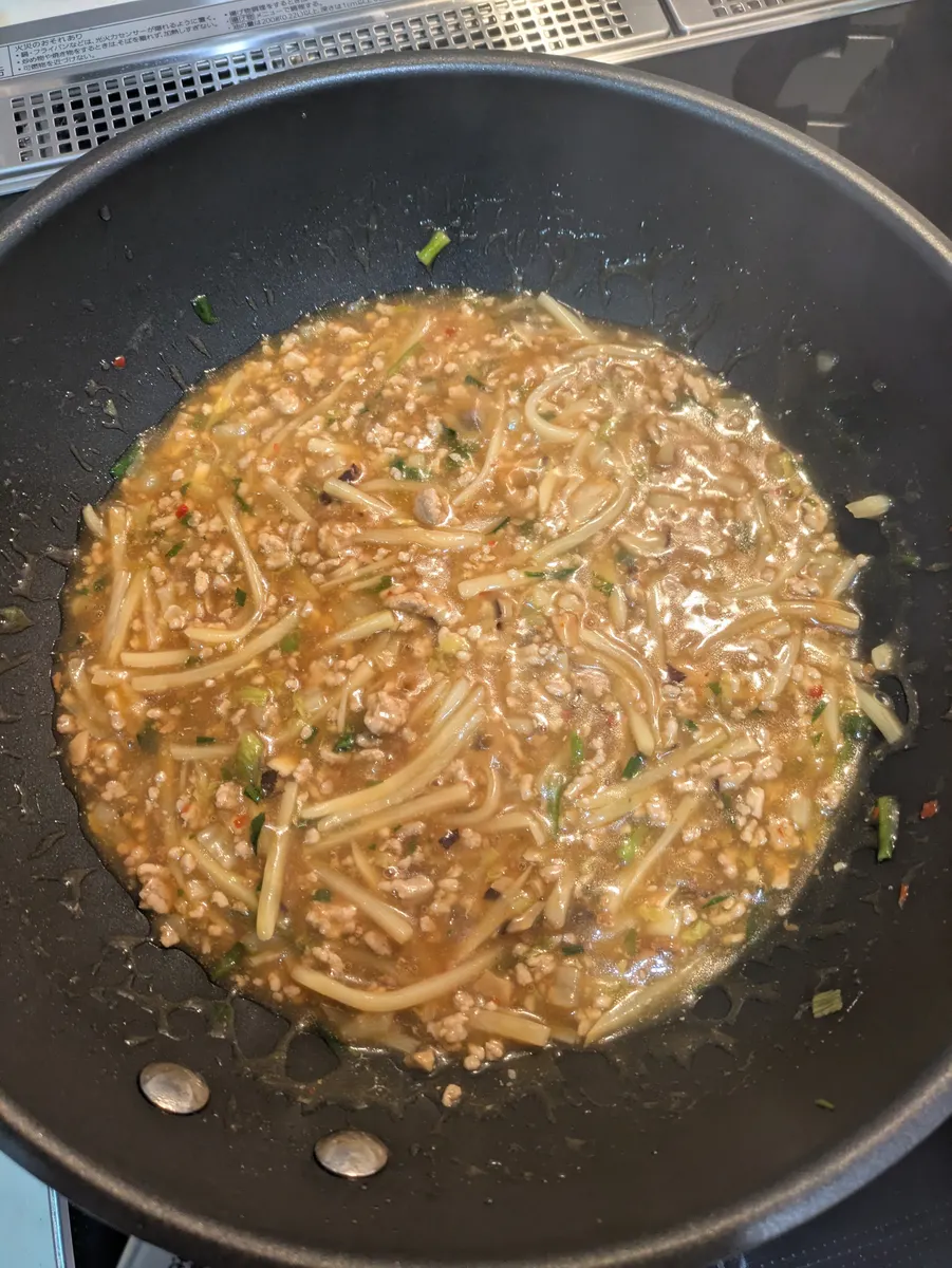 具材に味が入った所で火を止め、水溶き片栗粉大匙1を入れ混ぜて再度火を入れていきます。