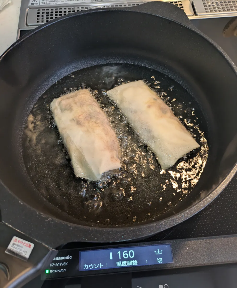 春巻きの皮に巻いたら揚げていきます♨️