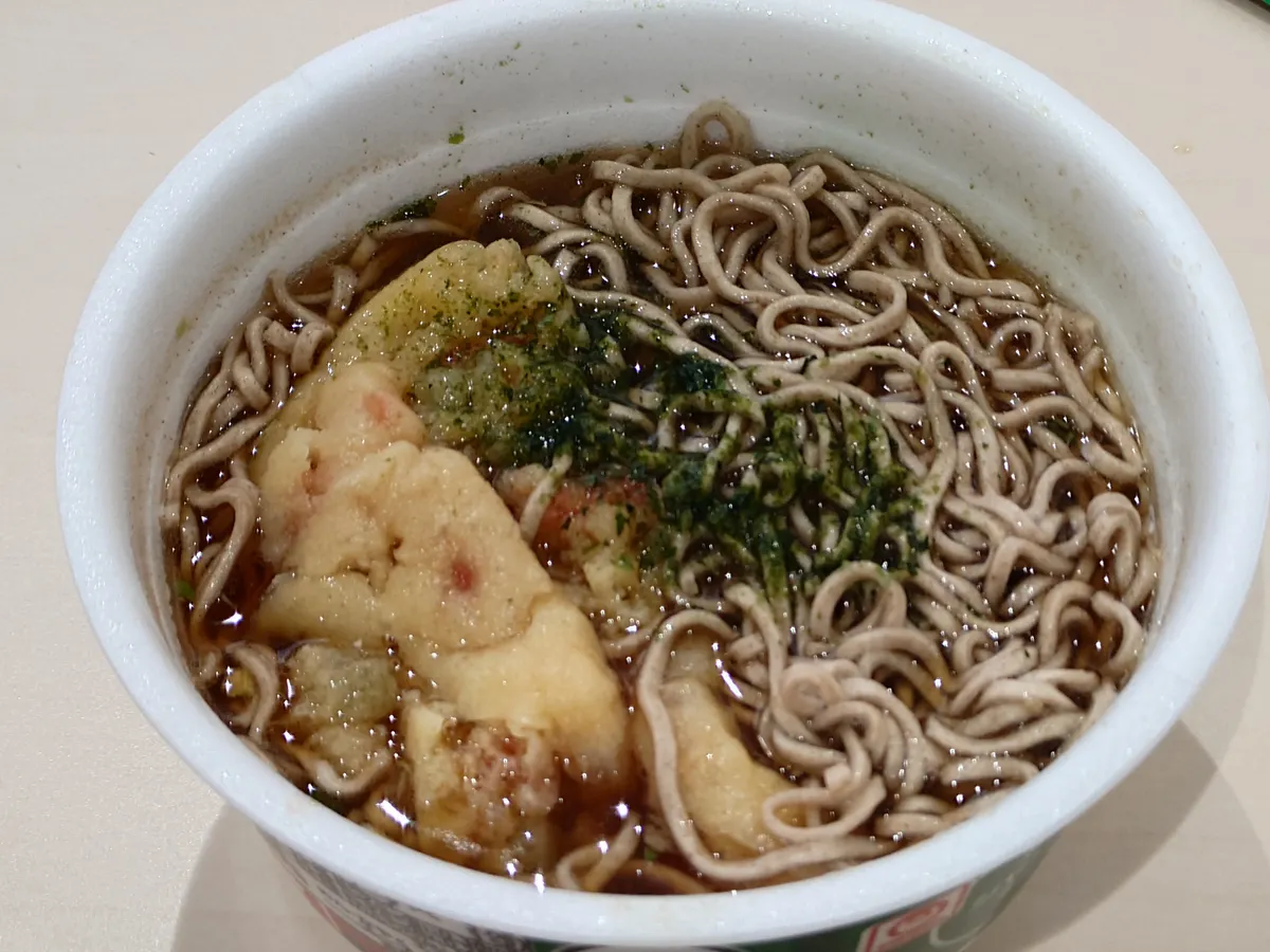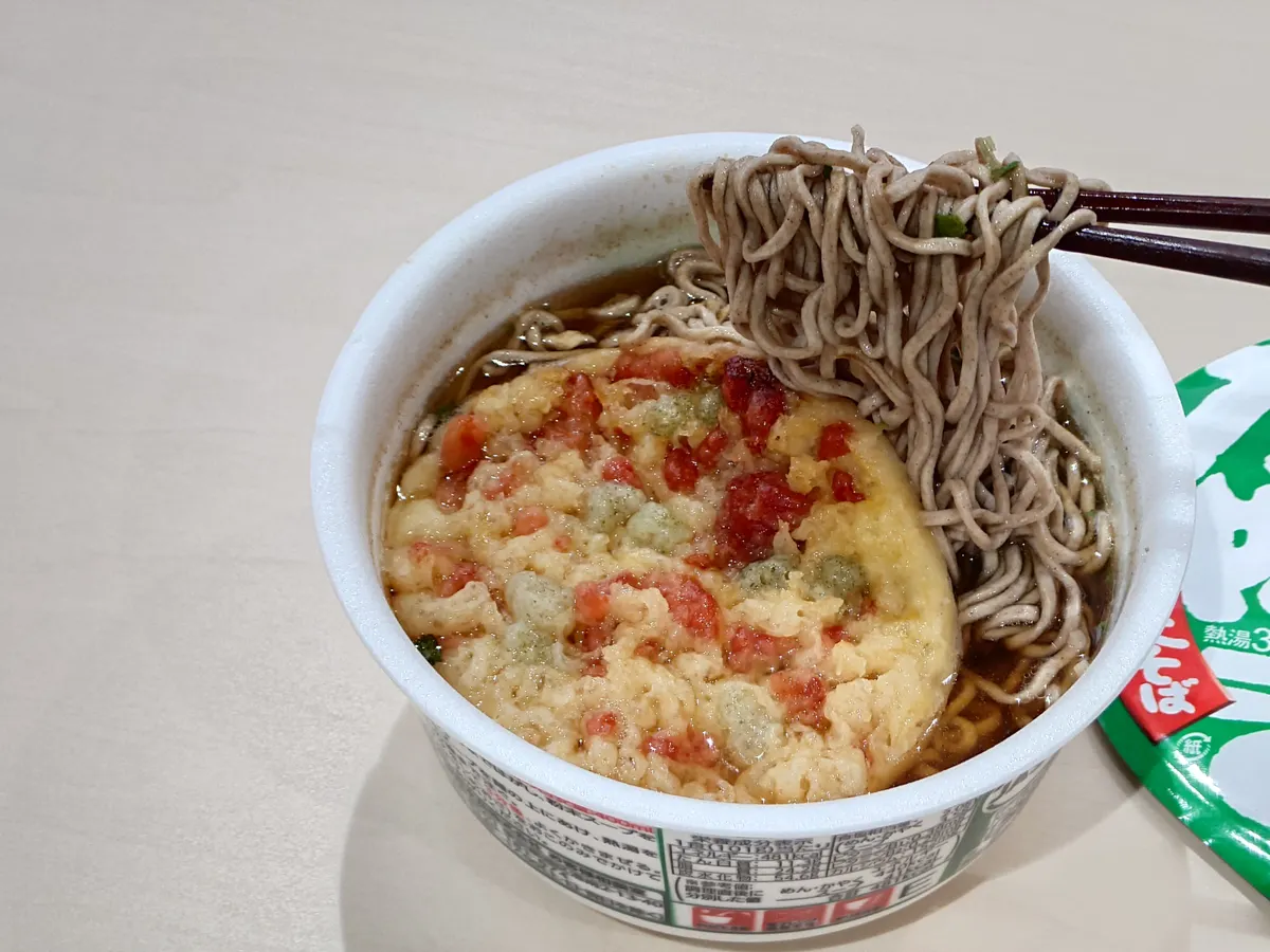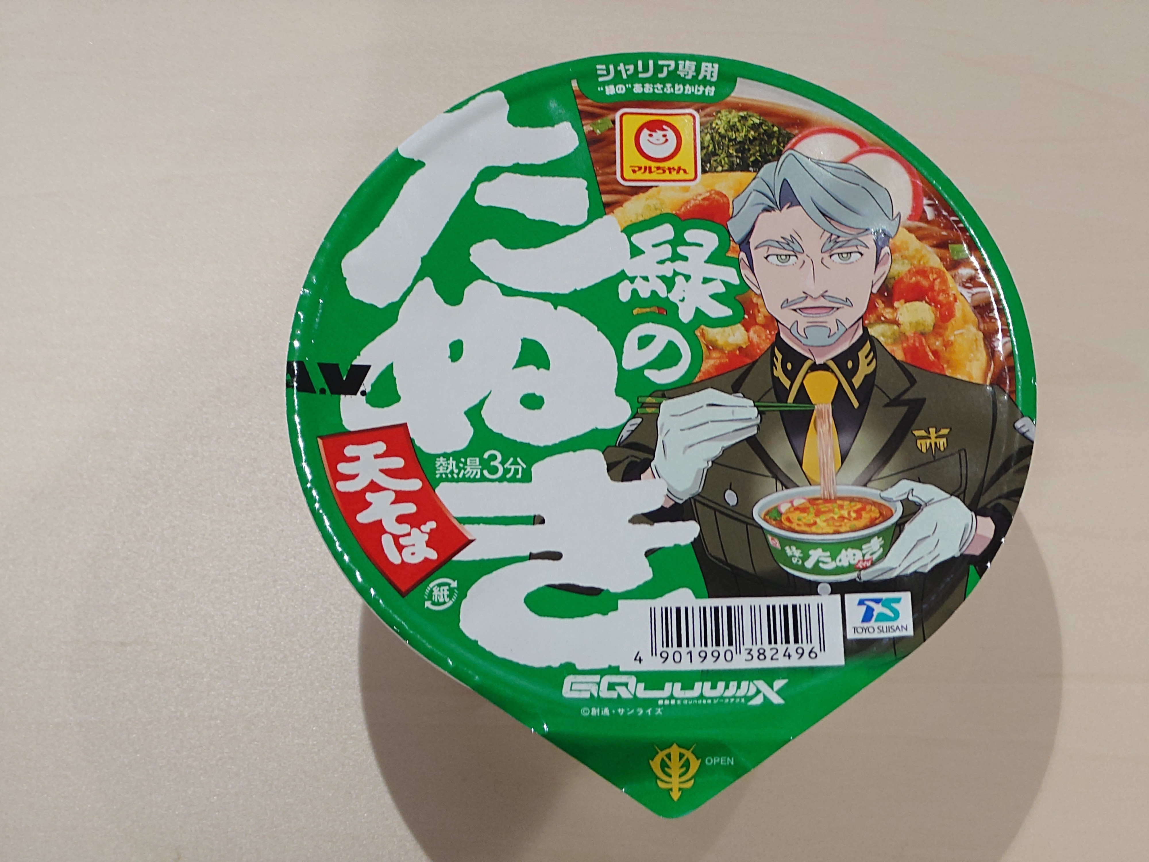 今朝は「マルちゃん 緑のたぬき 天そば」をいただきました。シャリア仕様になってます。